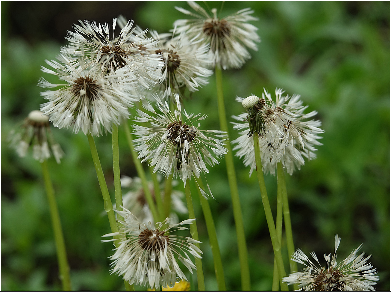 Верхушки побегов с созревшими соплодиями в утренней росе. Московская обл., Раменский р-н, окр. дер. Хрипань, садовый участок. 22.05.2023.