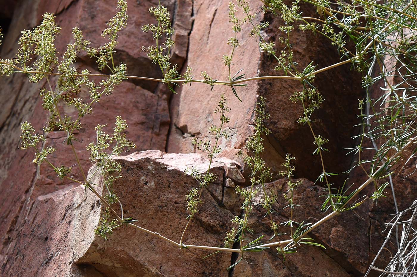 Цветущее и плодоносящее растение. Казахстан, Алматинская обл., нац. парк "Алтын-Эмель", горы Чулак, ущ. Кызылауз, трещина в скале. 25 июня 2023 г.