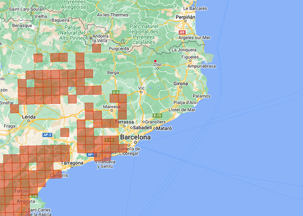 А здесь даже карта распространения из базы данных Banc de dades de biodiversitat de Catalunya. Маленькая красная точка (над Olot) - это примерное место съёмки, все квадраты остаются значительно западнее.