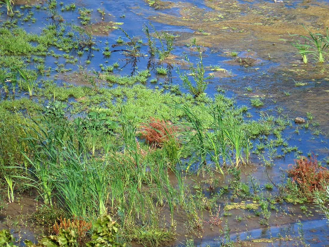 Растения на поверхности болотца, образовавшегося в период летне-осенней межени. Ульяновск, Заволжский р-н, пляж Куйбышевского водохранилища. 31.08.2023.