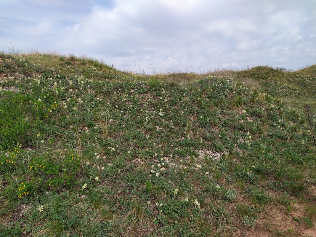Цветущее растение с подлетающей к соцветию пчелой-плотником (Xylocopa valga). Самарская обл., Похвистневский р-н, южный крутой склон горы Копейка. 03.05.2023.