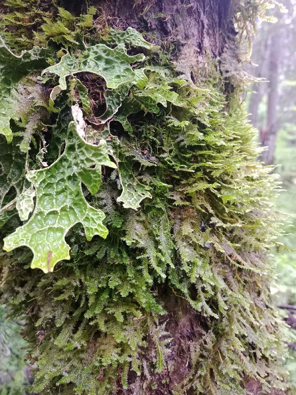 Слоевище в микросообществе с Neckera pennata. Ханты-Мансийский автономный округ, Березовский р-н, памятник природы "Лешак-Щелья", ур. Чёртов яр, пихтарник кисличный, на стволе рябины (Sorbus). 29.07.2024.
