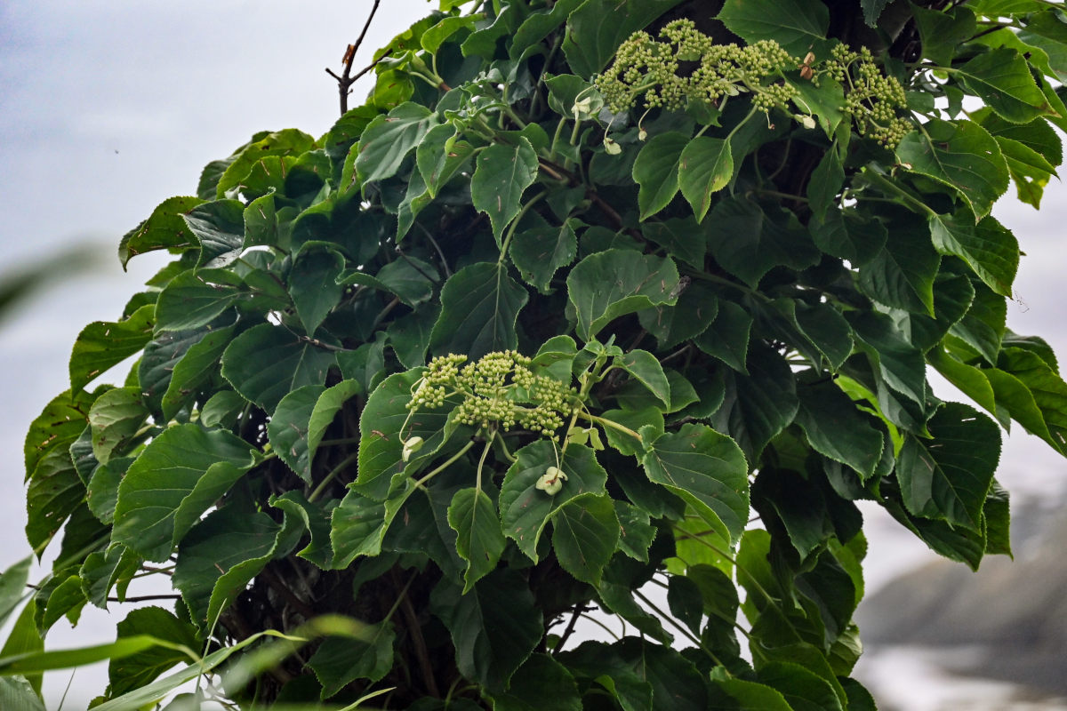Верхушки побегов с отцветающими соцветиями и формирующимися плодами. Курильские о-ва, о-в Итуруп, долина р. Водопадная, опушка широколиственного леса, на стволе Betula. 17.08.2023.