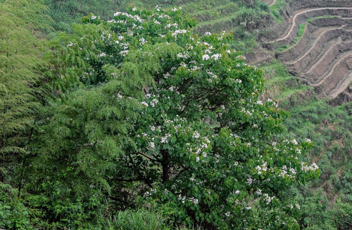 Крона цветущего дерева. Китай, провинция Гуанси, рисовые террасы Лунцзи, опушка бамбуковой рощи. 29.05.2024.