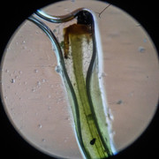 Верхушки веточек; светлые образования — спорангии миксомицета Arcyria cinerea s.l. Свердловская обл., окр. г. Заречный, заболоченный участок леса. 28.06.2024.