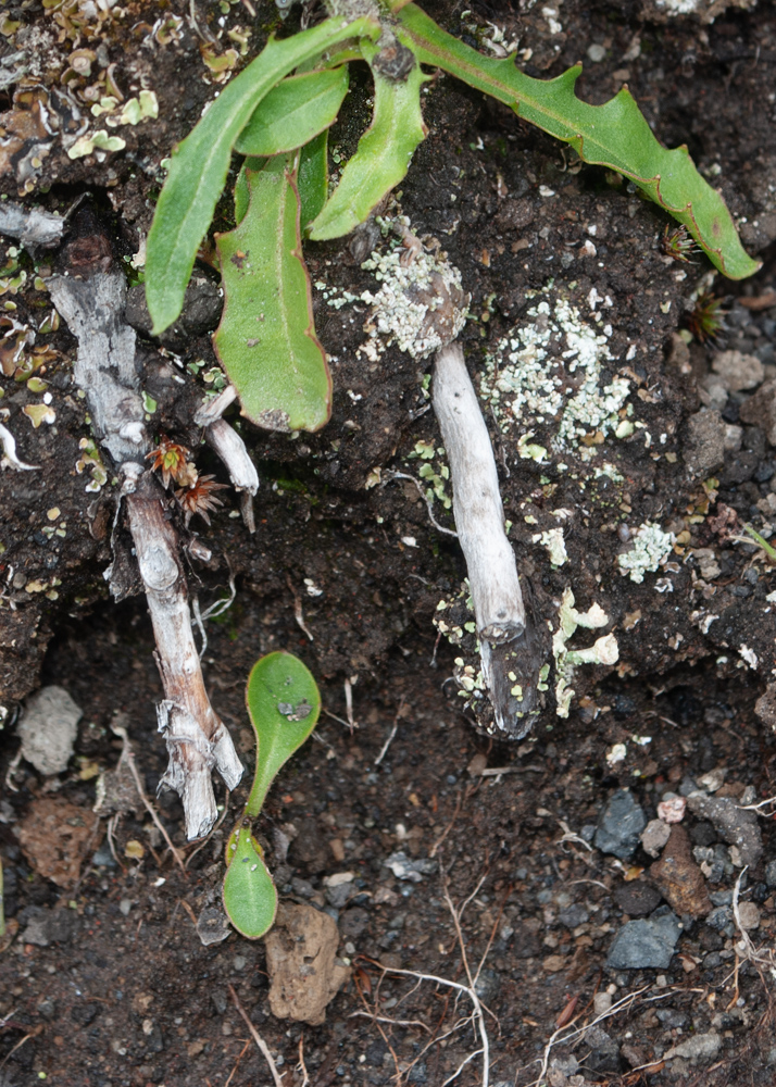 Листья прикорневой розетки взрослого растения и молодое растение. Камчатский край, Елизовский р-н, природный парк "Вулканы Камчатки", южный участок, кластер "Налычевский", памятник природы экструзия «Верблюд», мохово-лишайниковая горная тундра. 11.08.2024.