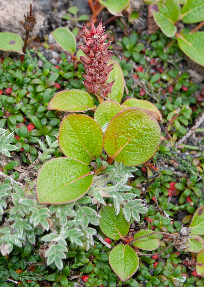 Листья и соплодие, выглядывающие из куртинки Diapensia obovata; на переднем плане видны листья Oxytropis sp. и побеги Cassiope lycopodioides. Камчатский край, Елизовский р-н, природный парк "Вулканы Камчатки", южный участок, кластер "Налычевский", памятник природы "Экструзия Верблюд", тундра. 11.08.2024.
