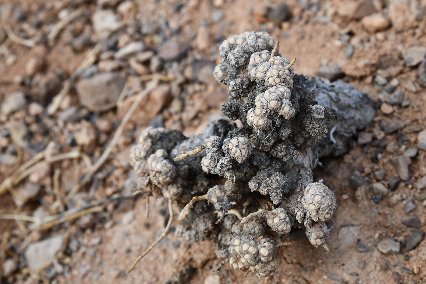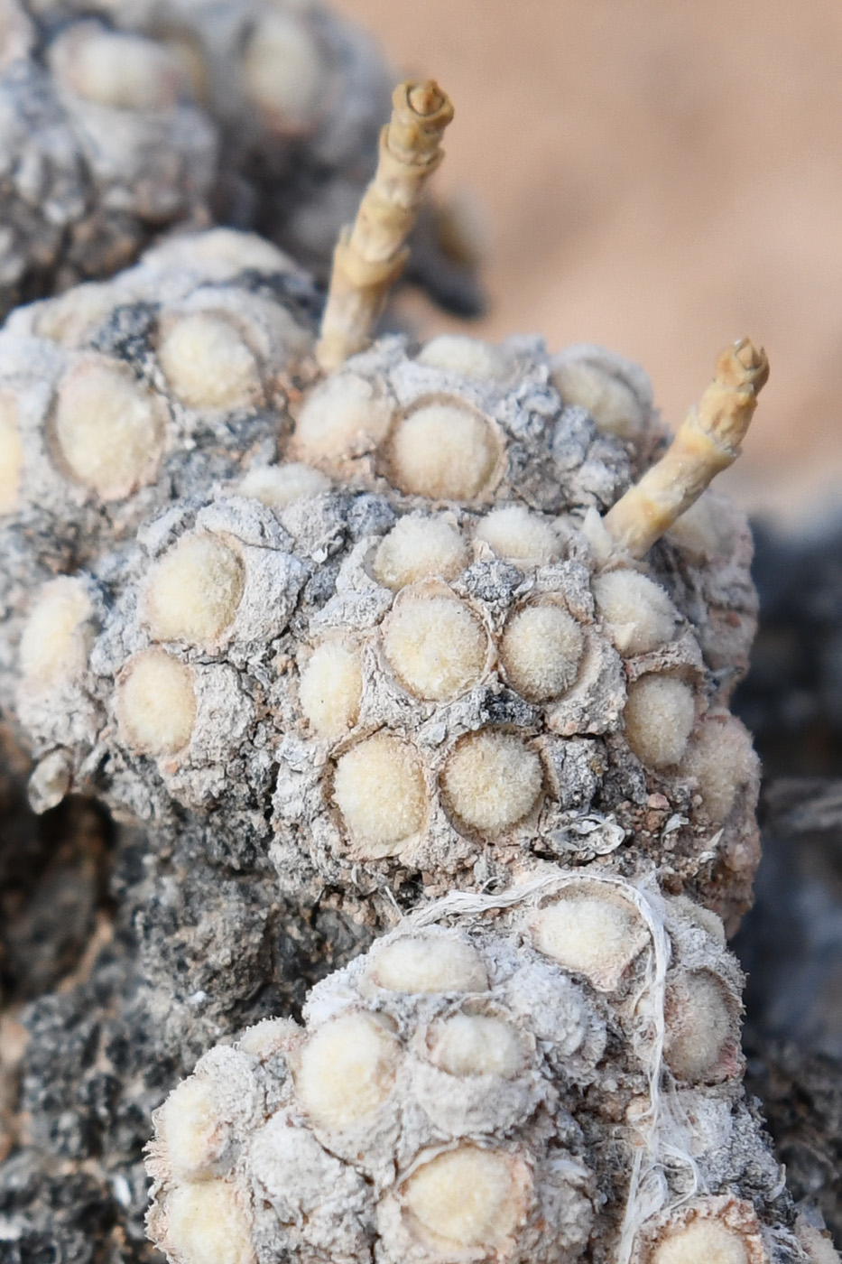 Растение в зимнем покое с обнажённым каудексом и частично опавшими отмершими веточками. Казахстан, Алматинская обл., нац. парк "Чарын", пестроцветный глинистый склон рядом с ущ. Жабыр. 22 января 2025 г.