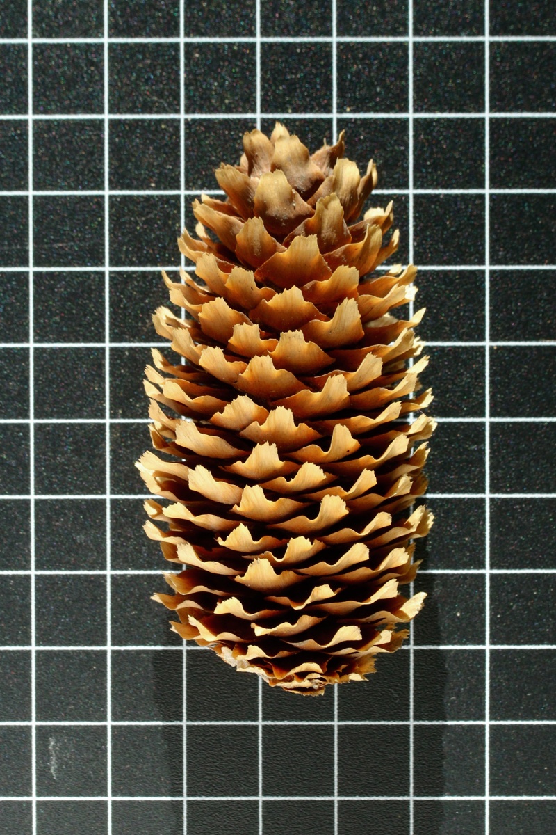 Зрелая шишка (чешуи растопырились после дня в условиях квартиры; сторона клетки — 1 см). Санкт-Петербург, Кировский р-н, озеленение. 22.03.2025.