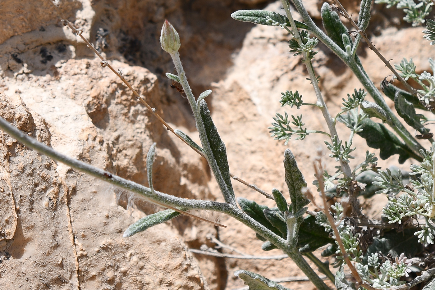 Цветущее растение (в сообществе с Artemisia). Таджикистан, Хатлонская обл., Кабодиёнский р-н, хр. Актау, горы Ходжа-Казиан (locus classicus), ур. Тахти-Сангин, сухой каменистый склон. 14 апреля 2025 г.