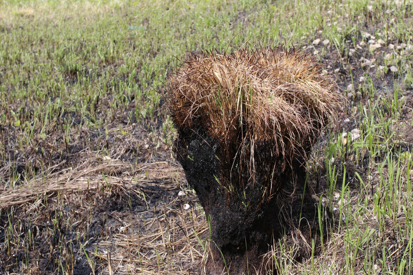 Обгоревшее во время пала расцветающее старое растение. Беларусь, Витебская обл., пос. Езерище, сырой луг между грунтовой дорогой и заболоченным ивняком. 09.05.2025.