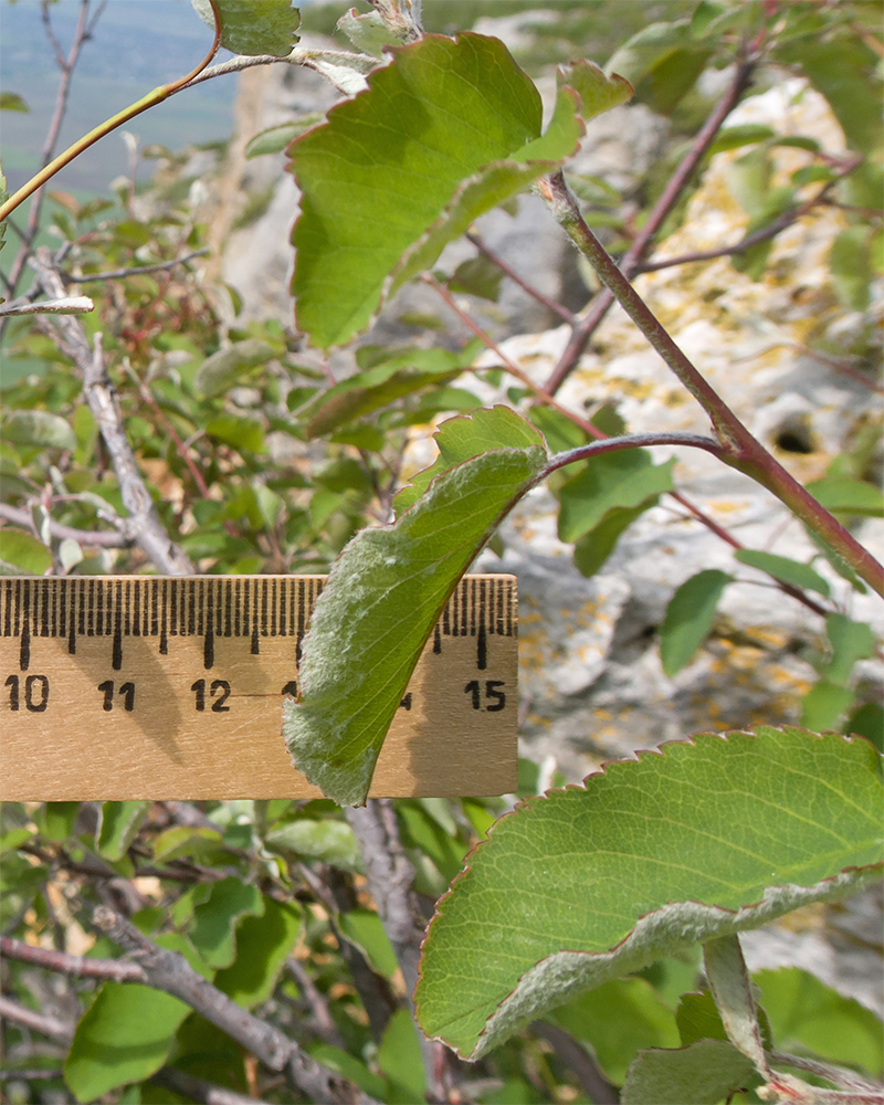 Верхушка ветки с незрелыми плодами (видна абаксиальная поверхность листьев). Карачаево-Черкесия, Зеленчукский р-н, гора Джангур, ≈ 1500 м н.у.м., на кромке скального обрыва в расщелине известняковой скалы. 04.06.2025.