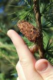 Часть ветви со зрелой шишкой. Санкт-Петербург, Кировский р-н, озеленение бульвара, в культуре. 27.09.2025.