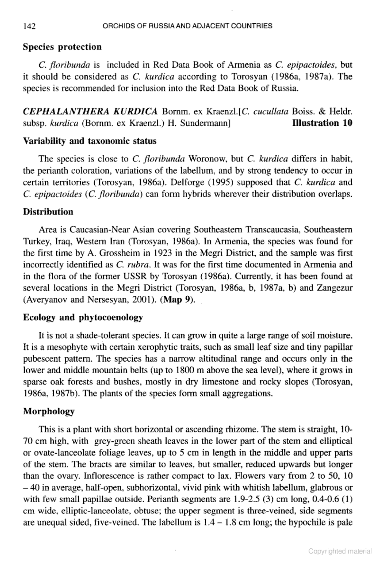 | Андрей Ковальчук | В общем, ситуация с парой C. kurdica / C. floribunda запутанная до нельзя, но, если придерживаться системы Черепанова, то, очевидно, эти растения лучше отнести к C. floribunda. Чуть проясняют ситуацию приложенные файлы - странички из книги Orchids of Russia and Adjacent States. |