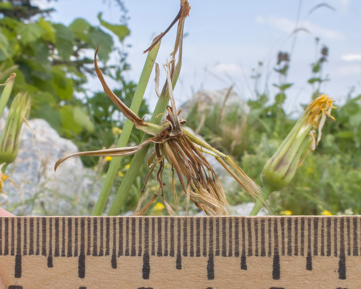 Отцветающее и плодоносящее растение. Краснодарский край, Апшеронский р-н, гора Черногор, платообразная вершина, ≈ 1750 м н.у.м., в расщелине скалы. 06.07.2019.