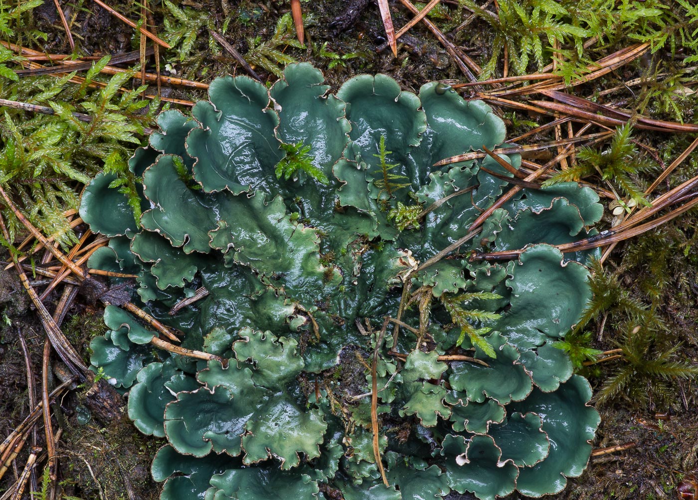 Здесь очень удачно лежит перевернутая лопасть. Ризины у этого вида образуют концентрические круги, и это хорошо видно на снимке. Кроме того, гладкая и блестящая верхняя поверхность. А если бы были апотеции — то можно было говорить о виде еще проще — у нее не свернутые в трубочку, как у большинства пельтигер, а плоские и круглые апотеции. |