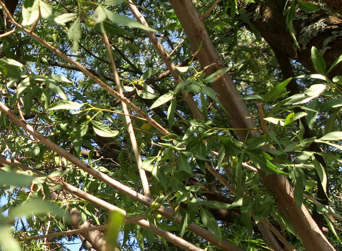 Плоды и листья на фоне почти горизонтальной скелетной ветви, покрытой лишайниками. ЮАР, пров. Гаутенг, пригород Киблер Парк (Kibler Park), природный запов. Клиприверсберг (Klipriviersberg Nature Reserve), усадебная часть, в культуре. 20.01.2025.