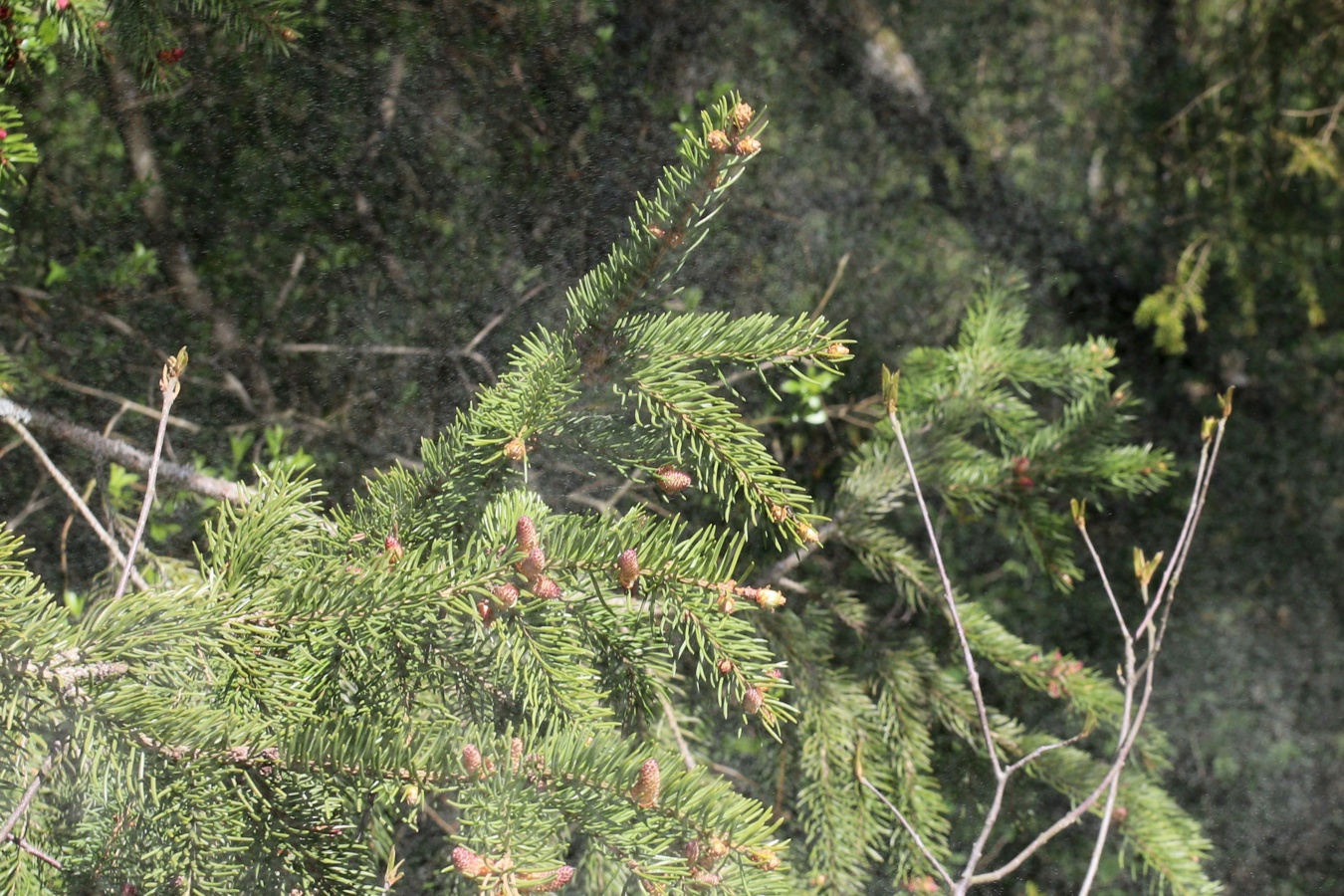 Ветвь с микростробилами, активно рассеивающими пыльцу. Ленинградская обл., Гатчинский р-н, окр. пос. Пудость, заброшенный травертиновый карьер, редкий травяной ельник. 21.05.2025.