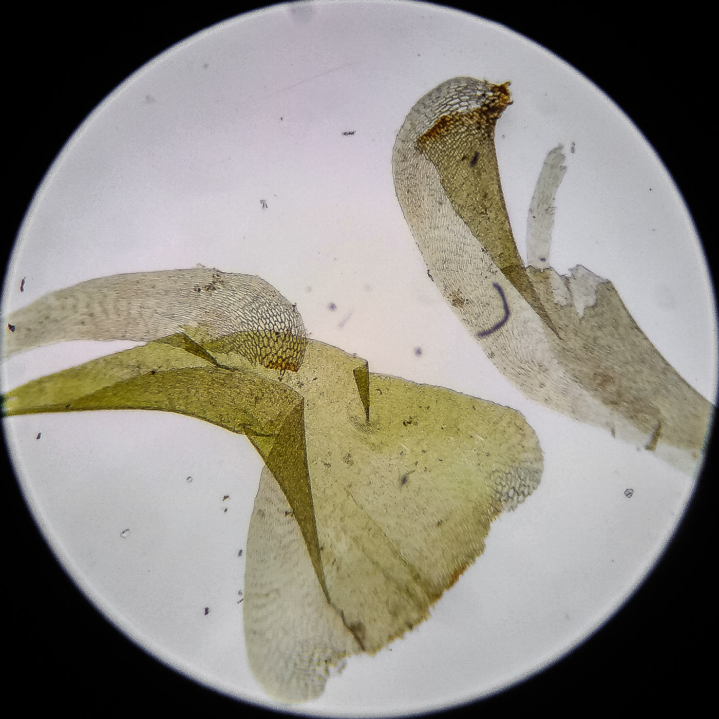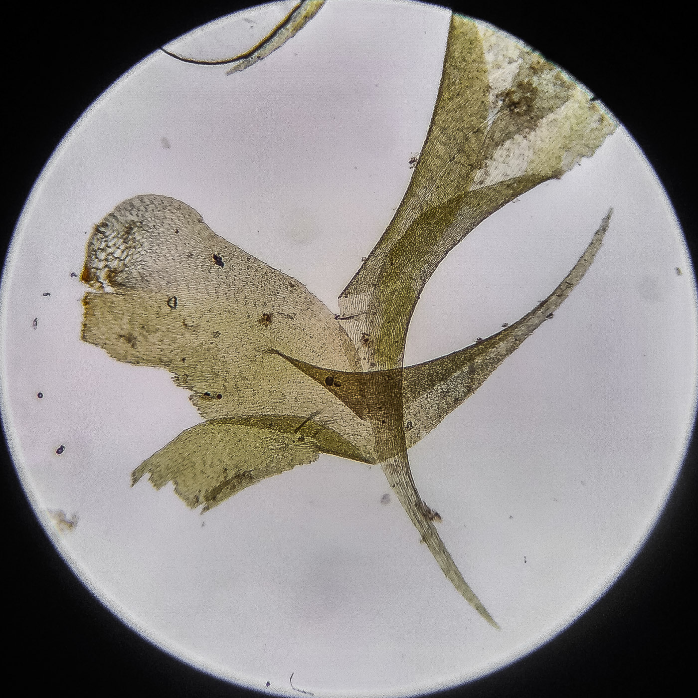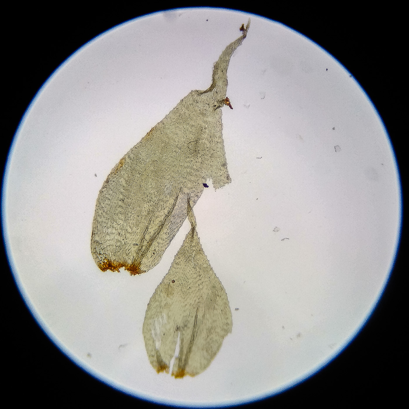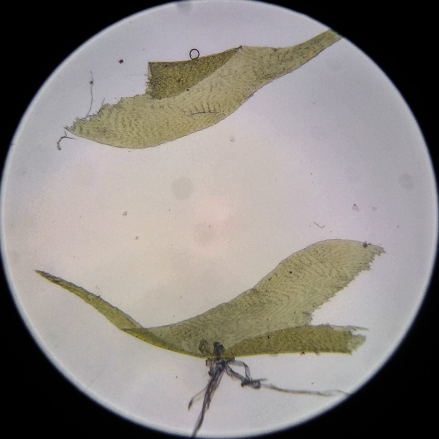 оказалась на свету, была жёлто-зелёной, а что под листвой — зелёной. Вид полностью соответствует описанию рода Rhytidiastrum Игнатовыми. А по широко яйцевидно-треугольным стеблевым листьям с оттопыренно отстоящей верхушкой суженной в ланцетно-шиловидную, желобчатую верхушку, остро пильчатому краю по всей длине — Rhytidiastrum subpinnatum.