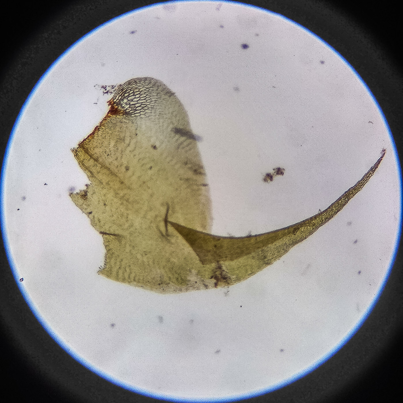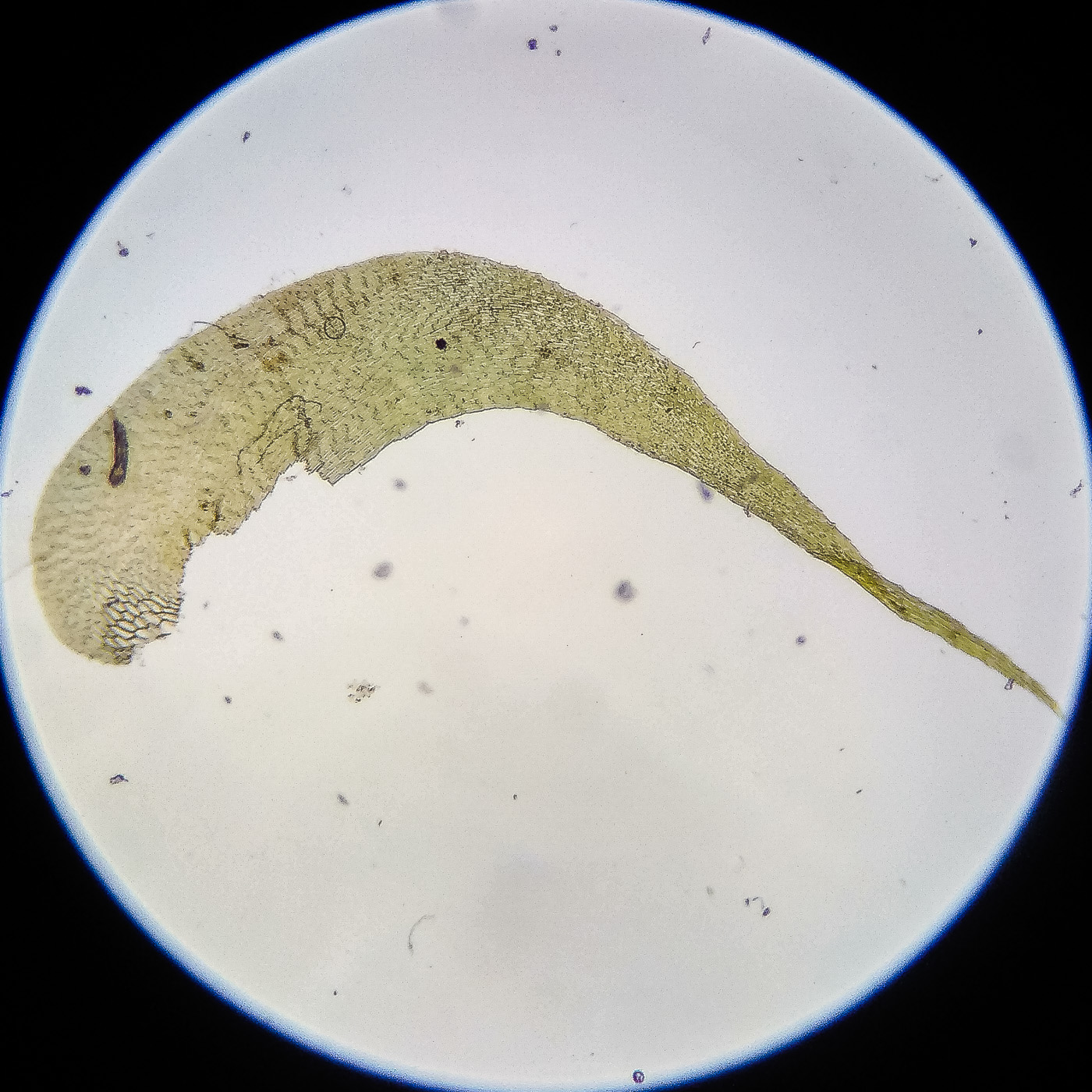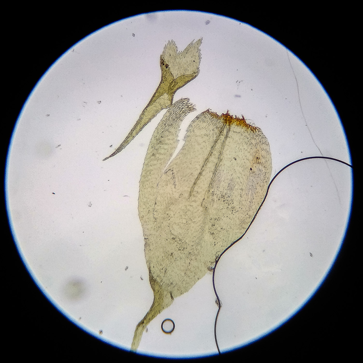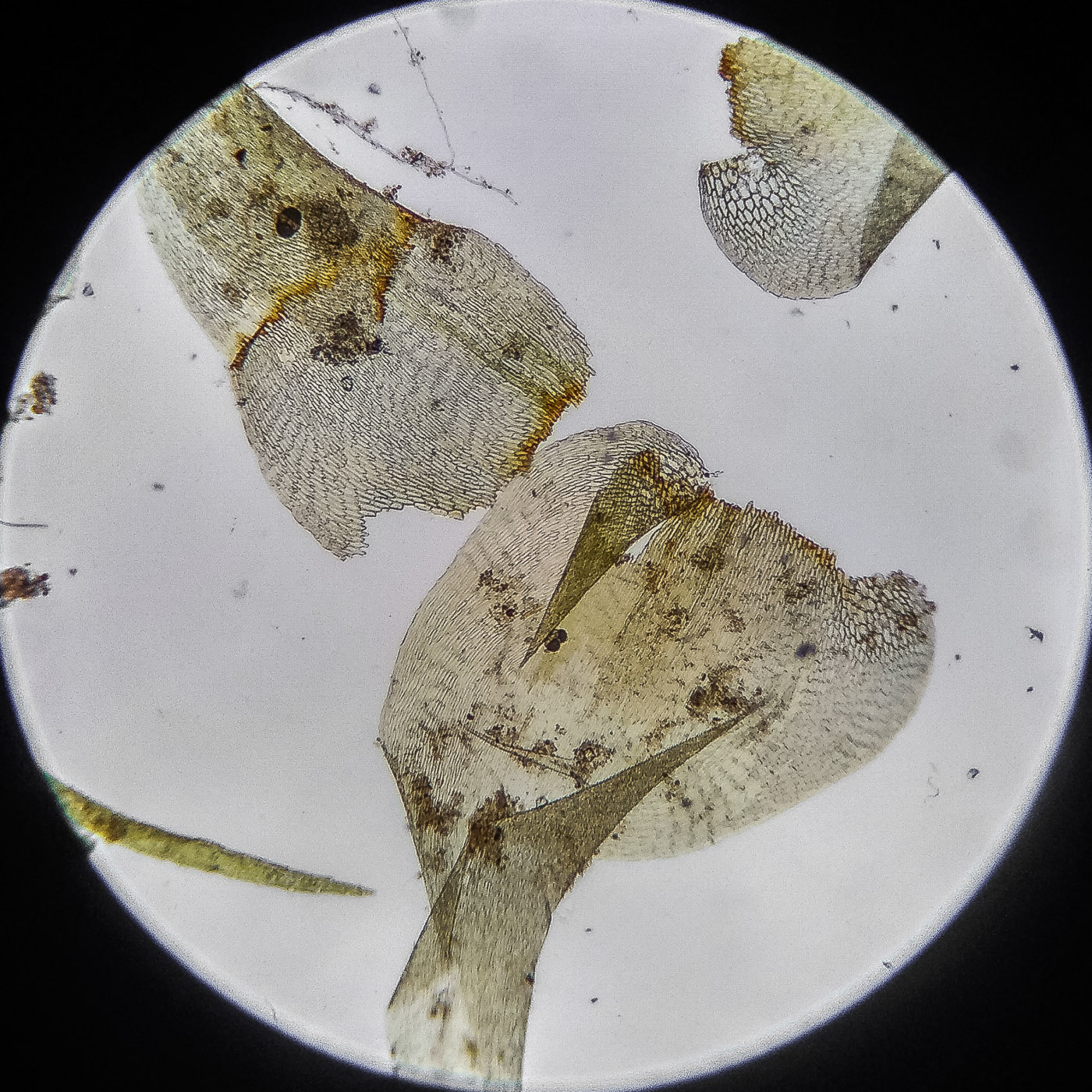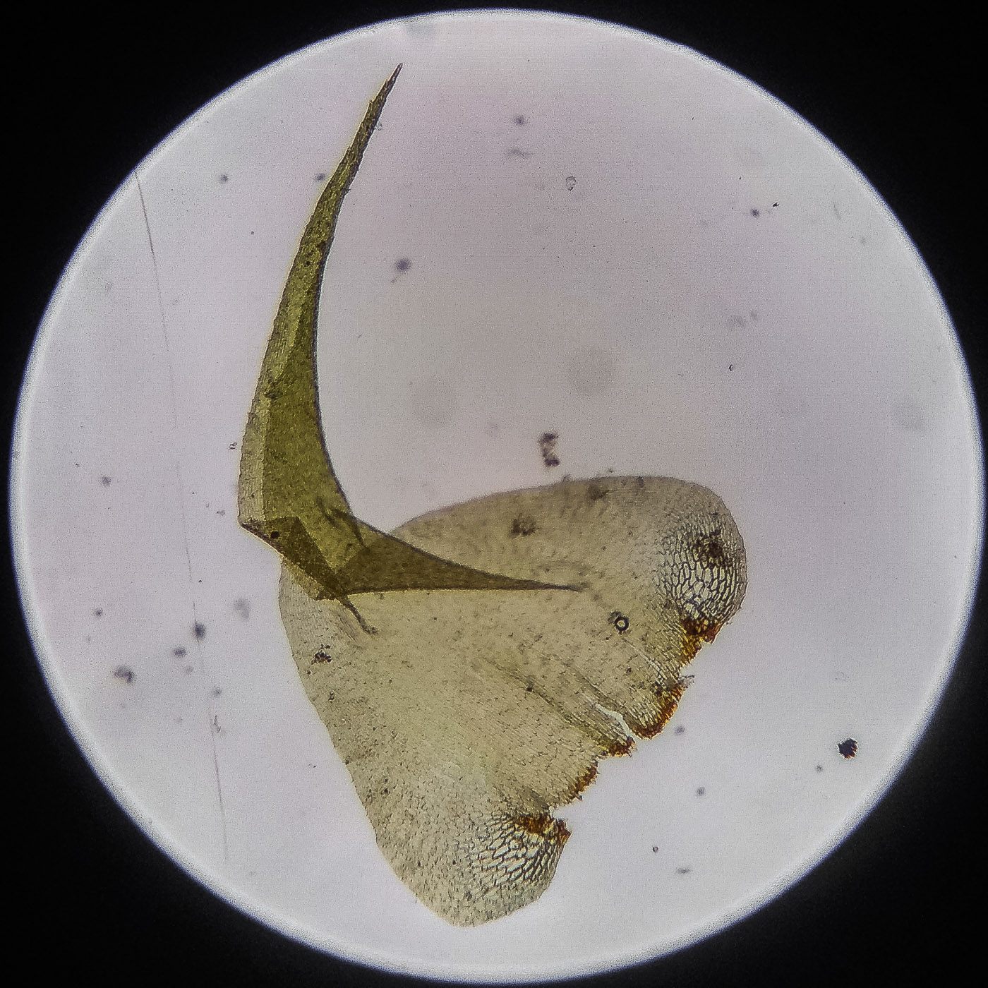 оказалась на свету, была жёлто-зелёной, а что под листвой — зелёной. Вид полностью соответствует описанию рода Rhytidiastrum Игнатовыми. А по широко яйцевидно-треугольным стеблевым листьям с оттопыренно отстоящей верхушкой суженной в ланцетно-шиловидную, желобчатую верхушку, остро пильчатому краю по всей длине — Rhytidiastrum subpinnatum.