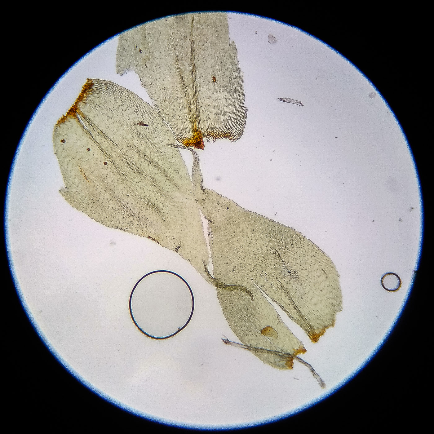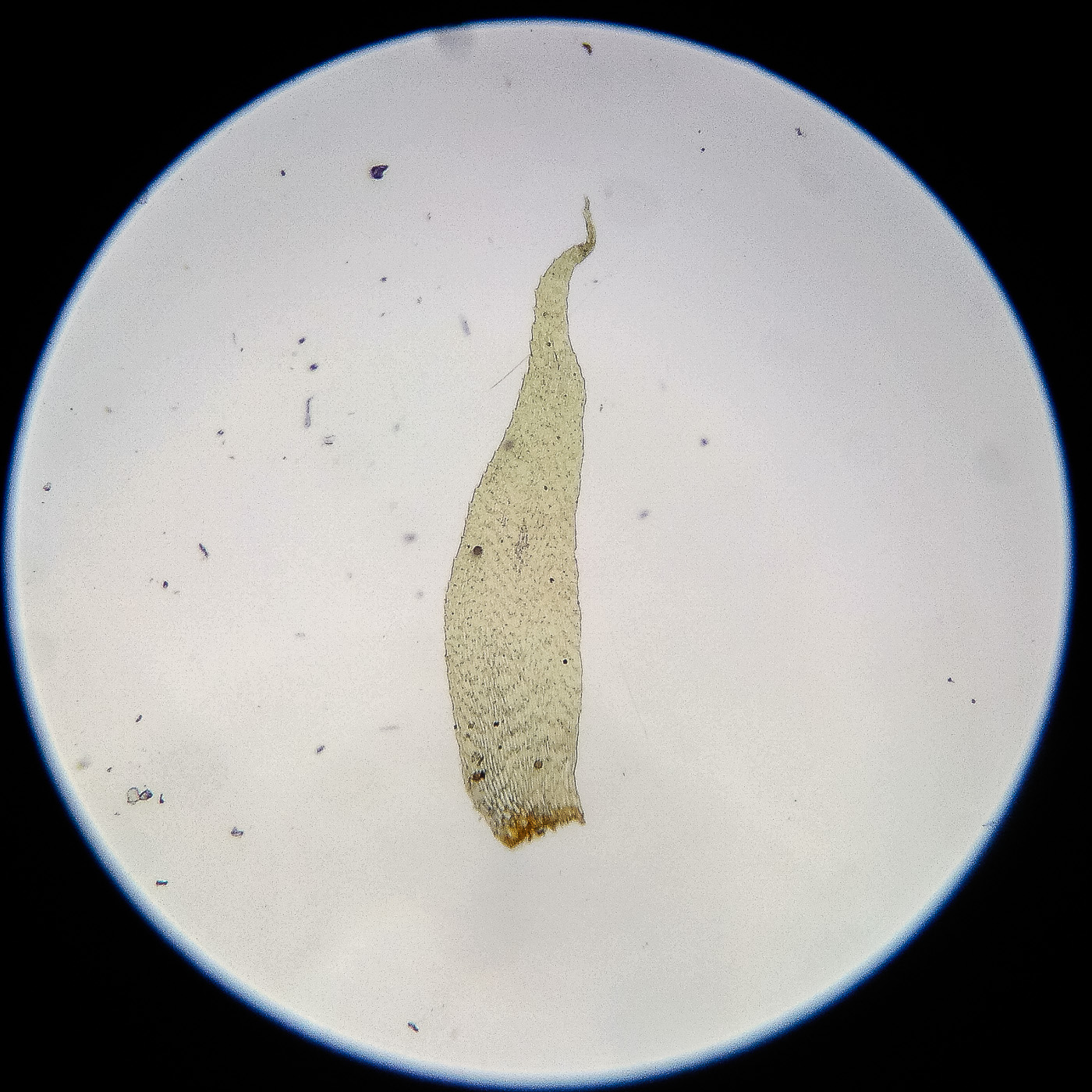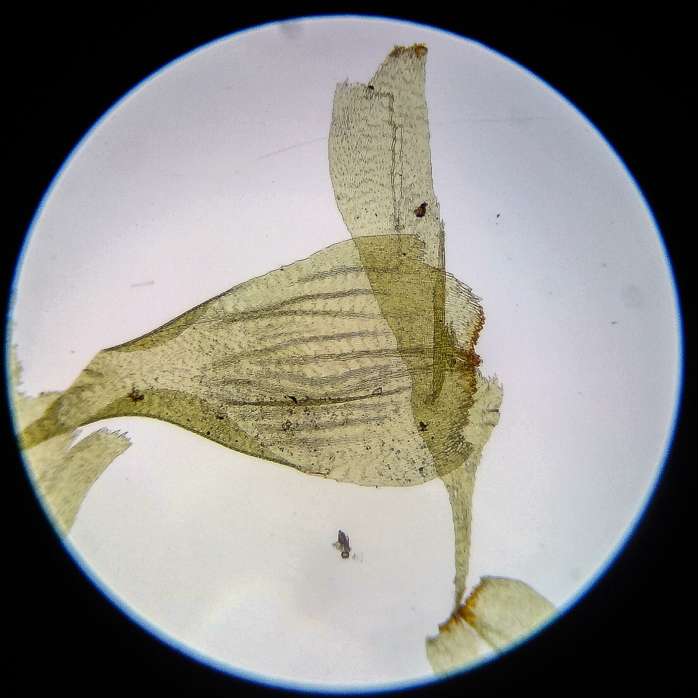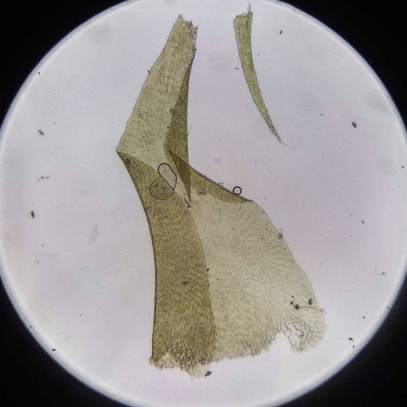 оказалась на свету, была жёлто-зелёной, а что под листвой — зелёной. Вид полностью соответствует описанию рода Rhytidiastrum Игнатовыми. А по широко яйцевидно-треугольным стеблевым листьям с оттопыренно отстоящей верхушкой суженной в ланцетно-шиловидную, желобчатую верхушку, остро пильчатому краю по всей длине — Rhytidiastrum subpinnatum.