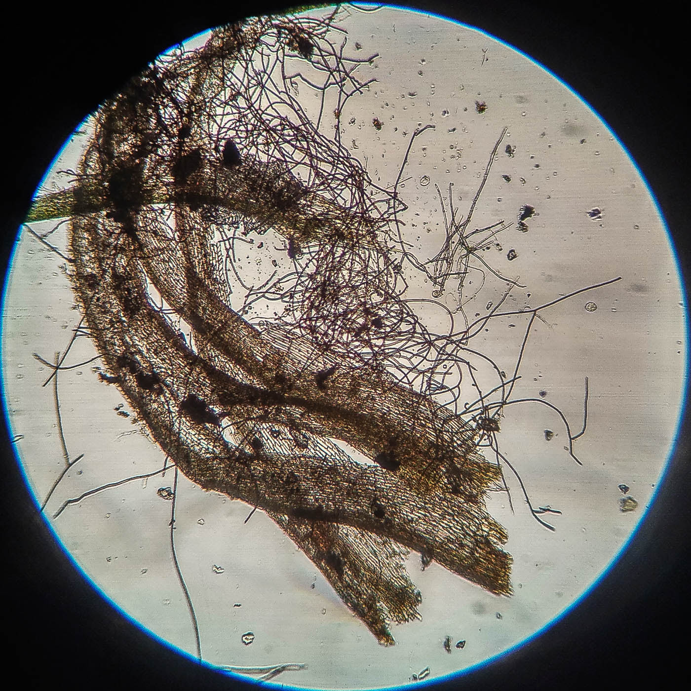 Вегетирующие растения в основании ствола Pinus sylvestris. Свердловская обл., окр. г. Заречный, Шеелитская горка, сосново-берёзовый лес. 16.11.2025.