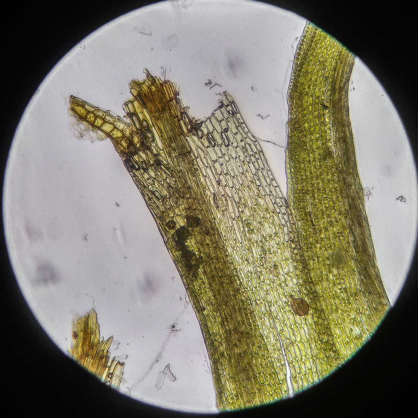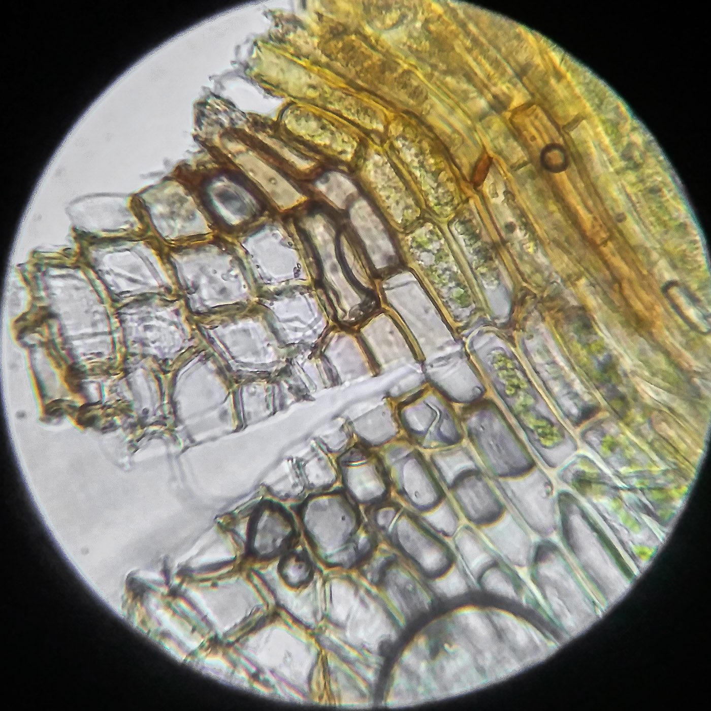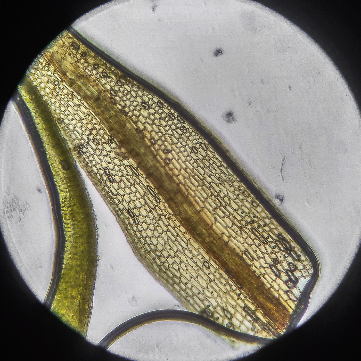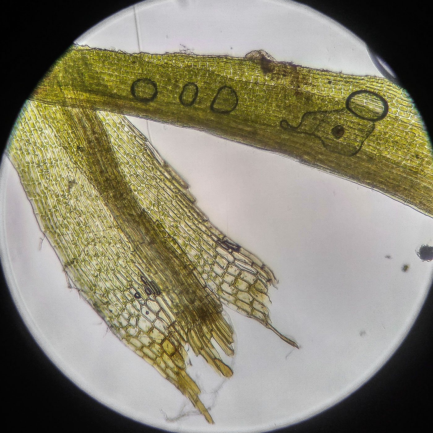 * клетки квадратные по всему краю и в верхней половине листа, мамиллозные, ближе к жилке и основанию — более прямоугольные, в основание становятся ещё шире, прозрачные или бурые; умеренно толстостенные, резко не отграничены;