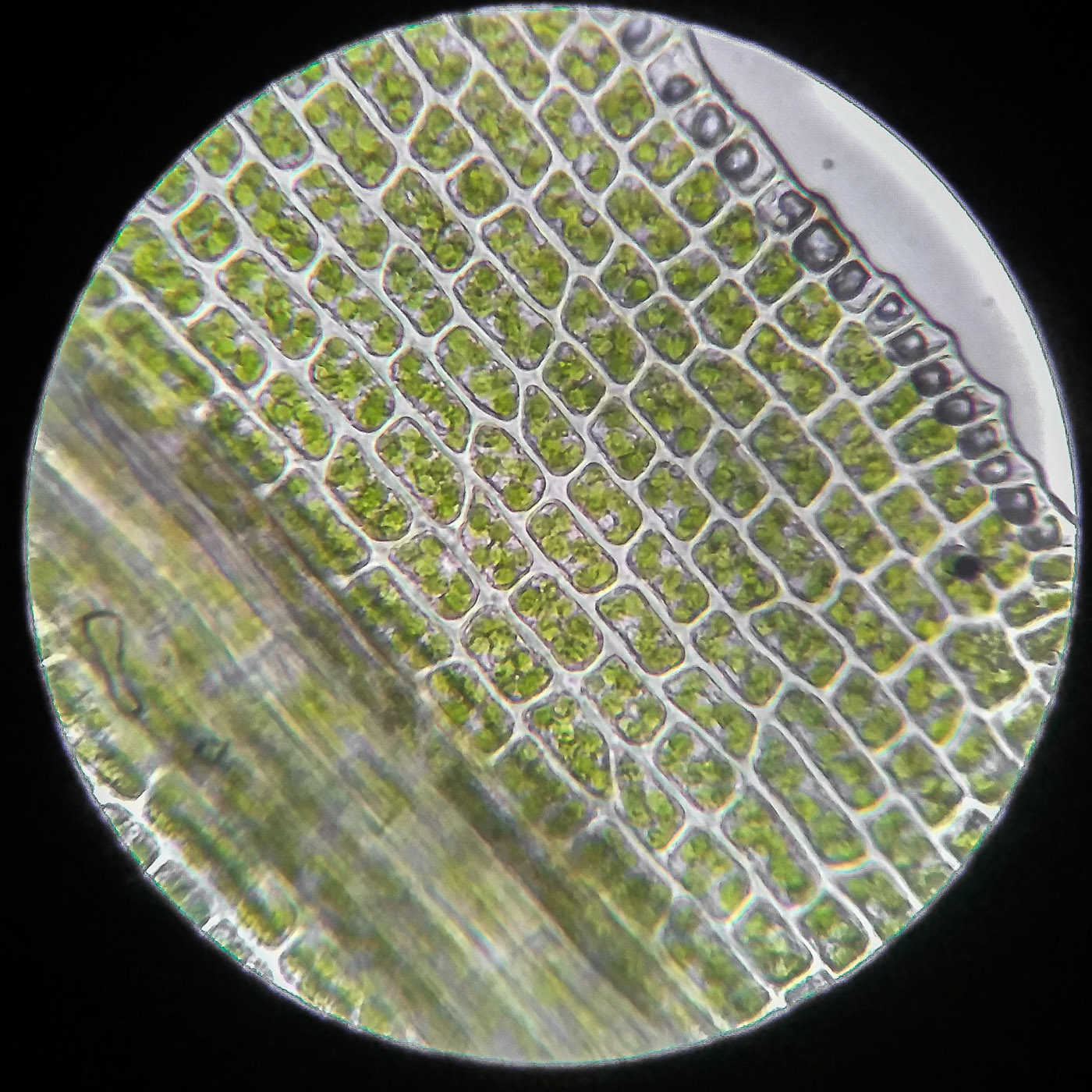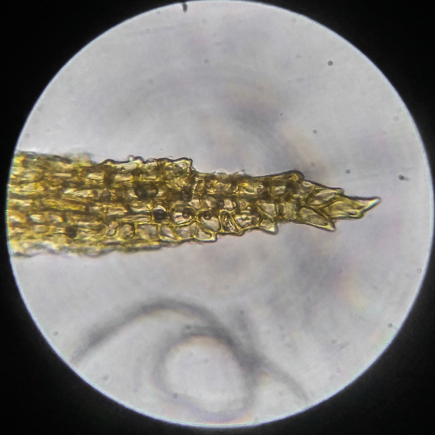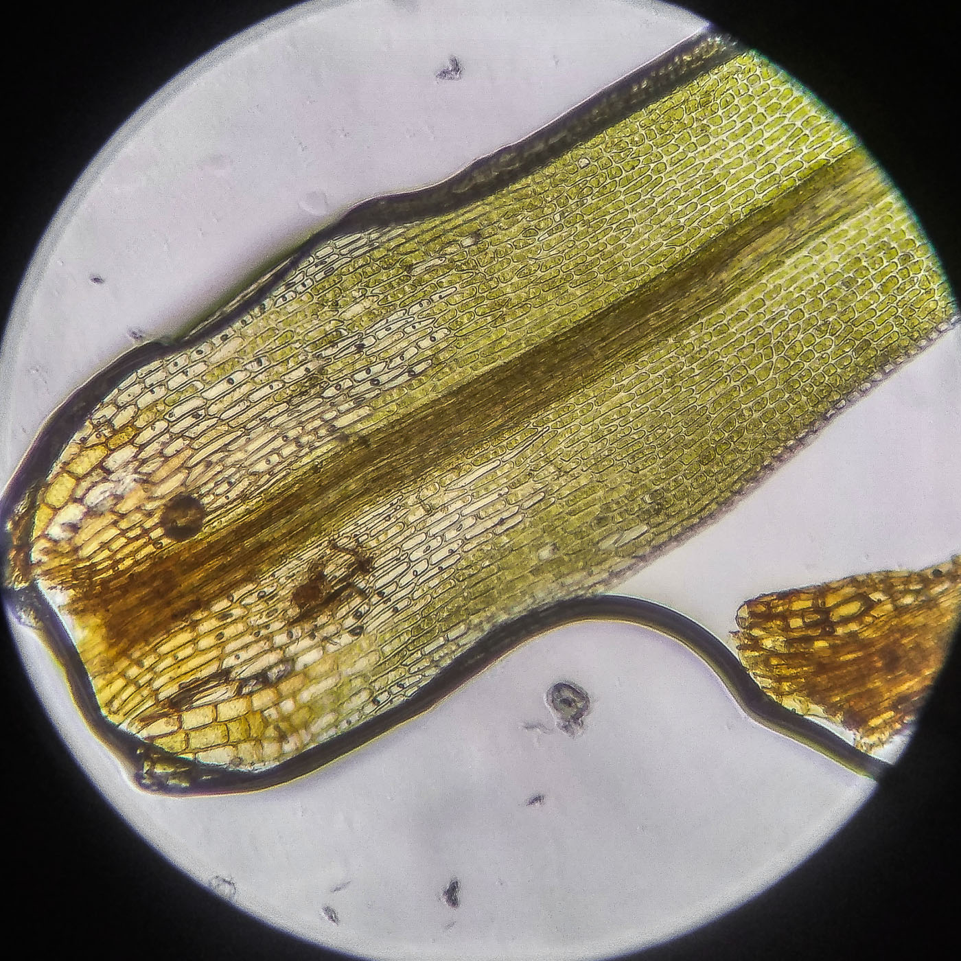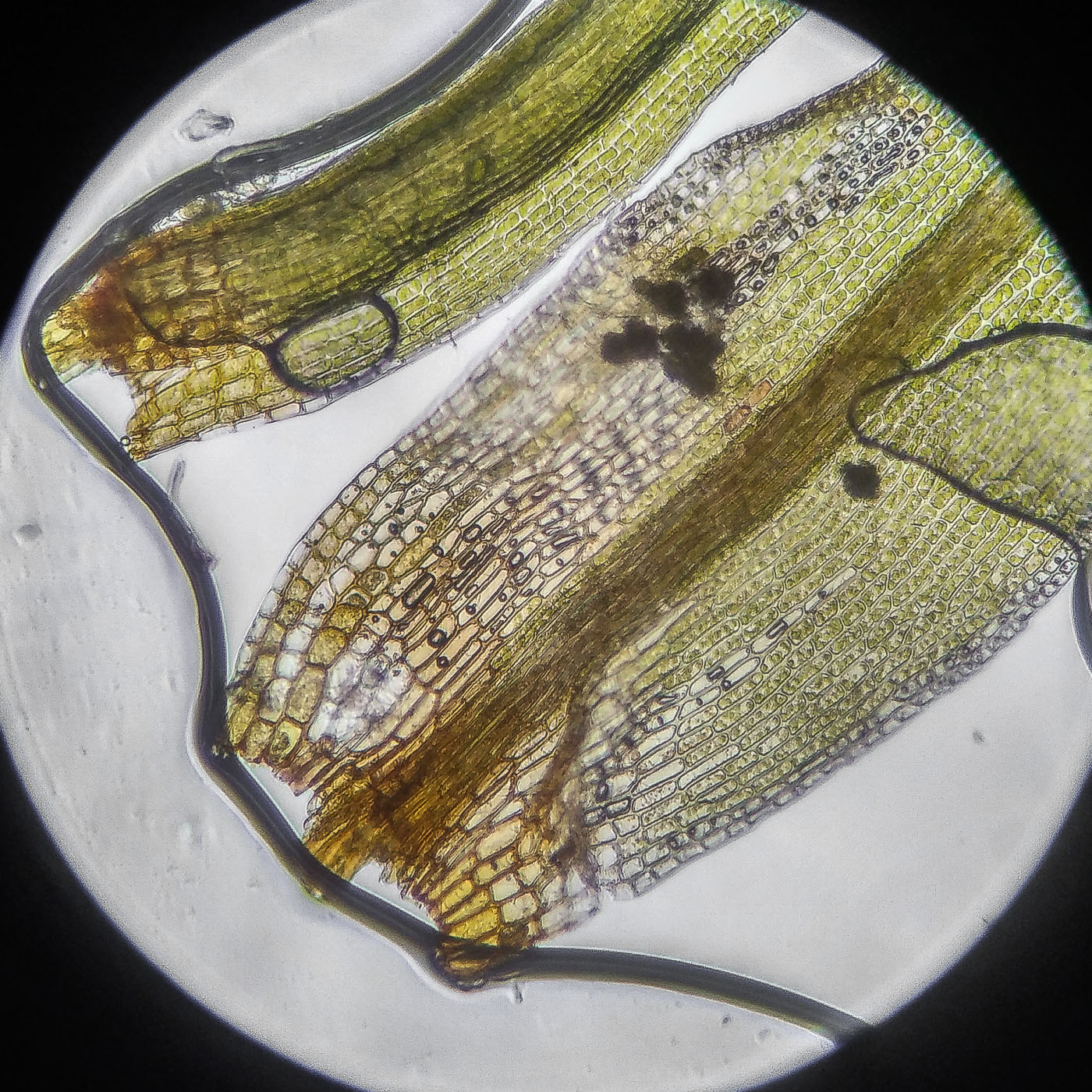 * клетки квадратные по всему краю и в верхней половине листа, мамиллозные, ближе к жилке и основанию — более прямоугольные, в основание становятся ещё шире, прозрачные или бурые; умеренно толстостенные, резко не отграничены;