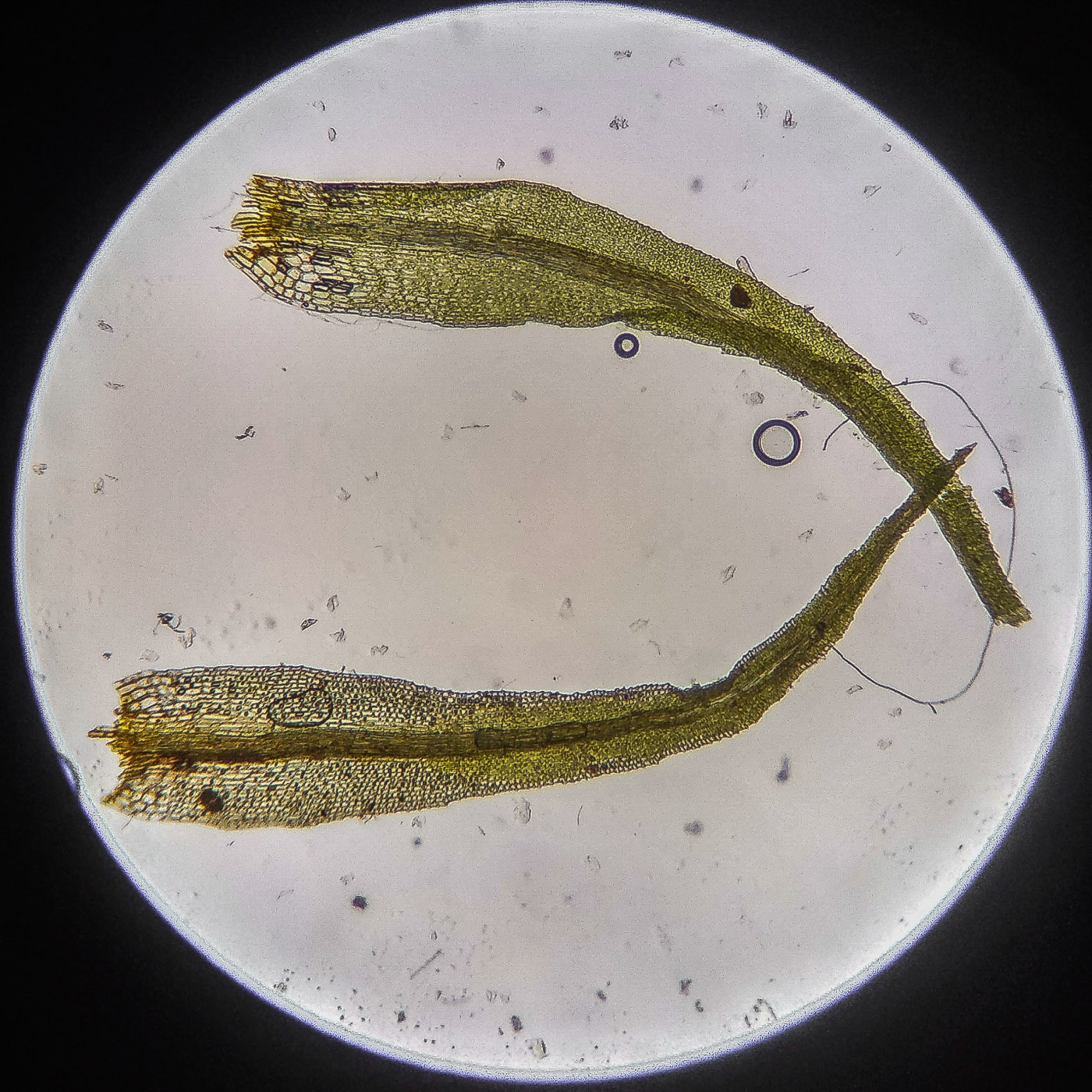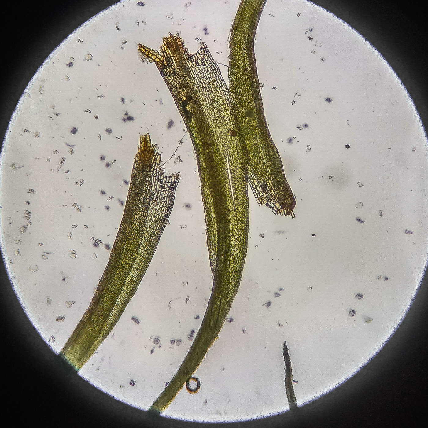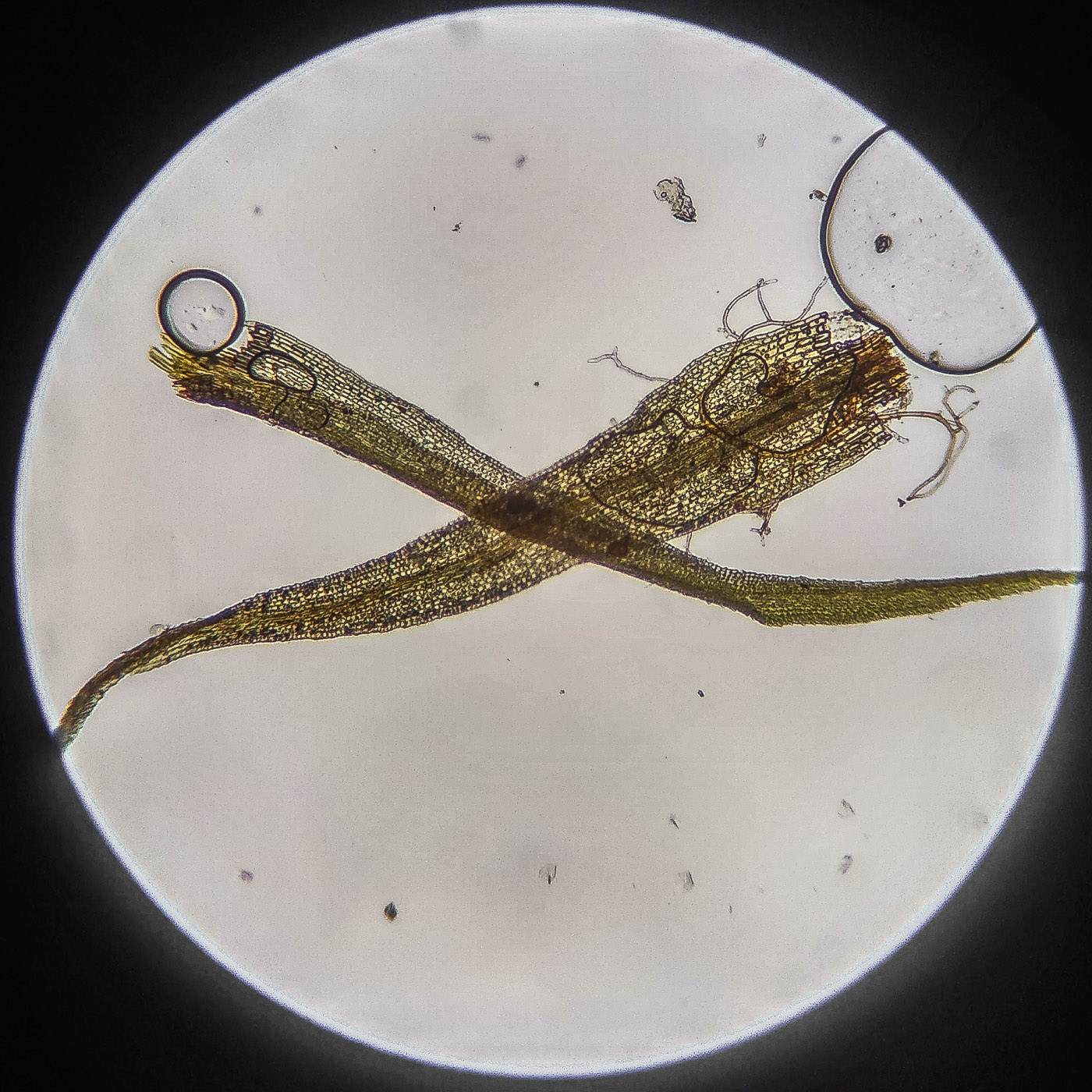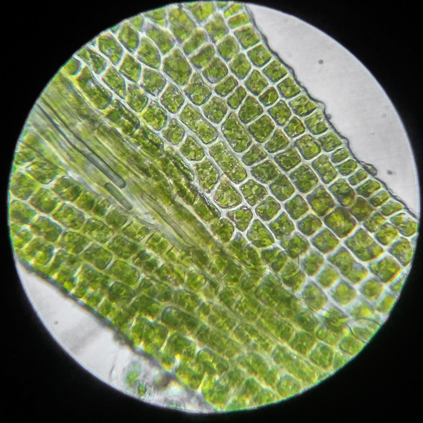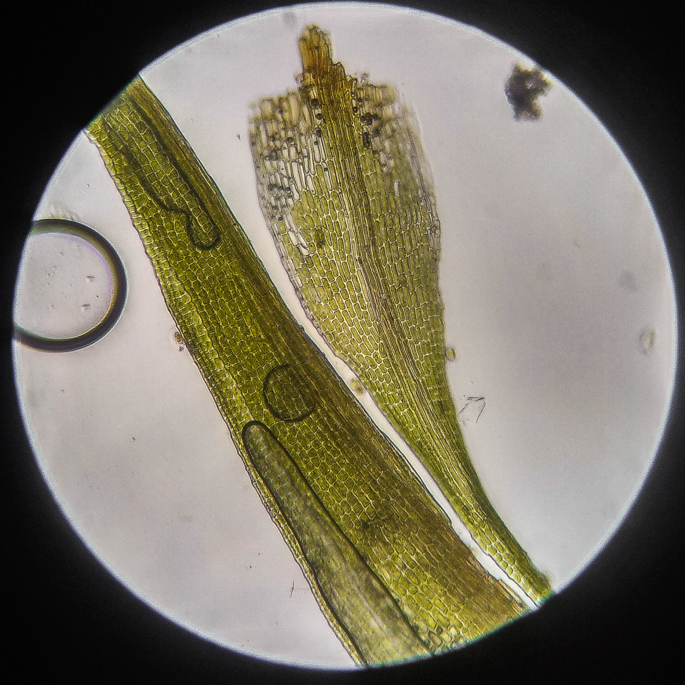 * клетки квадратные по всему краю и в верхней половине листа, мамиллозные, ближе к жилке и основанию — более прямоугольные, в основание становятся ещё шире, прозрачные или бурые; умеренно толстостенные, резко не отграничены;
