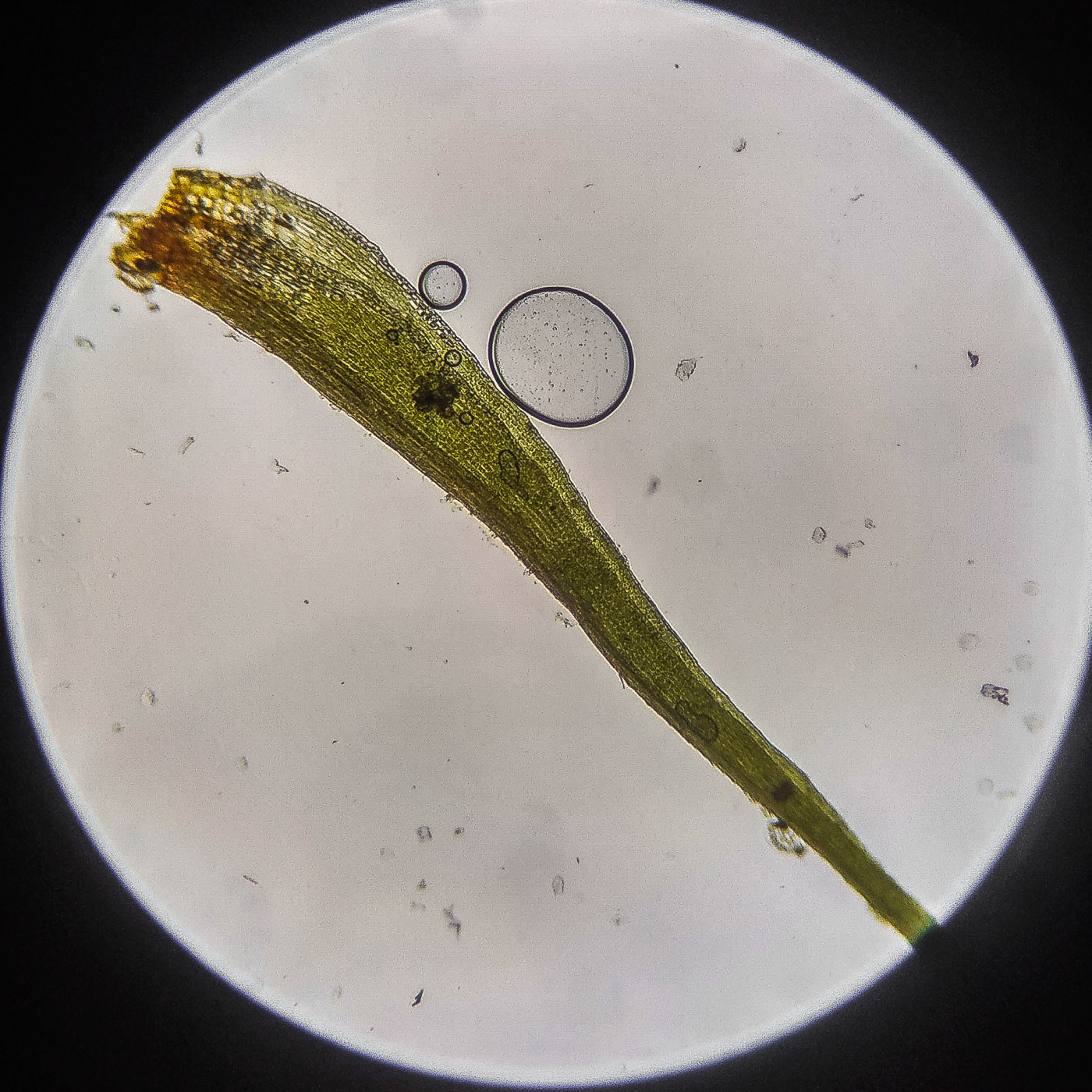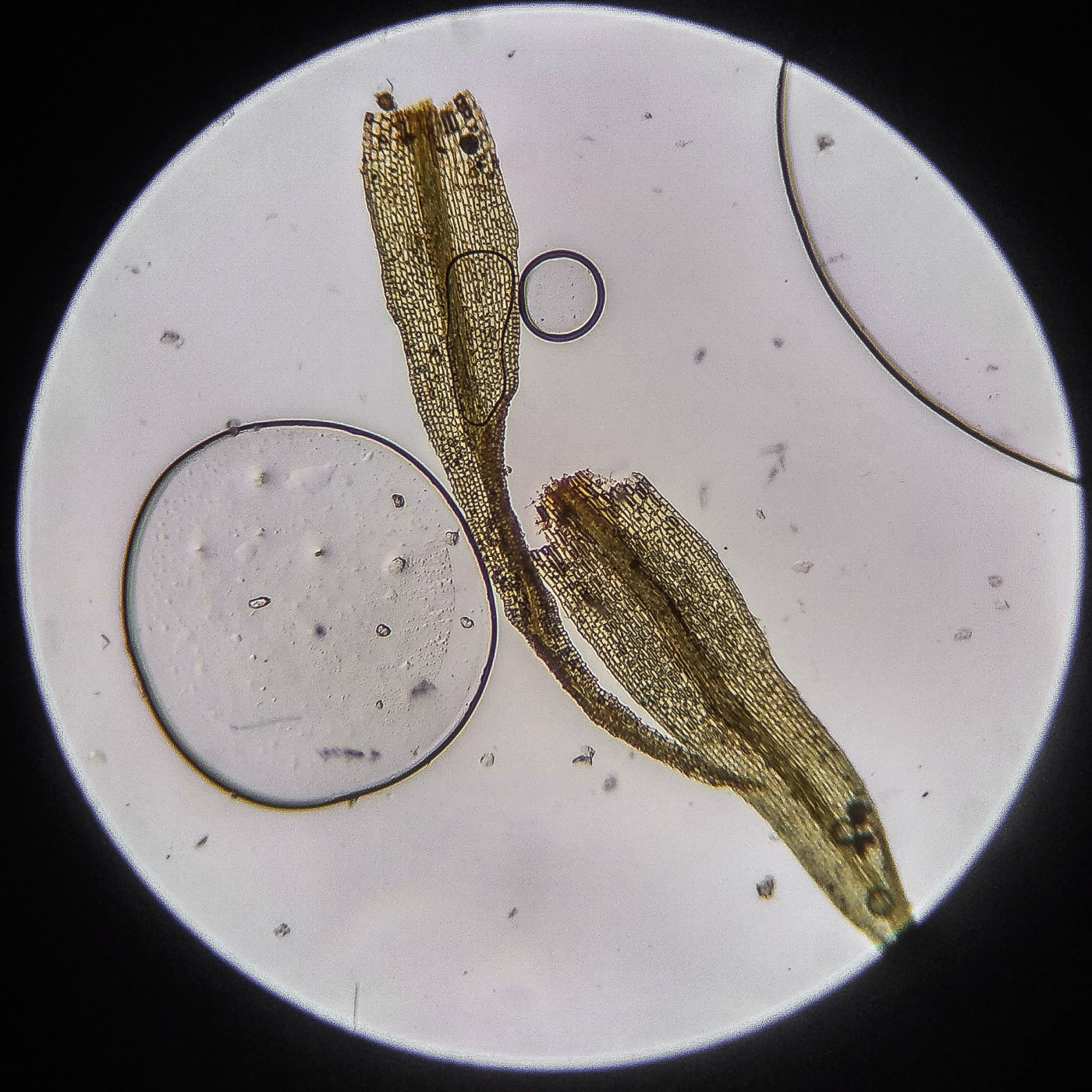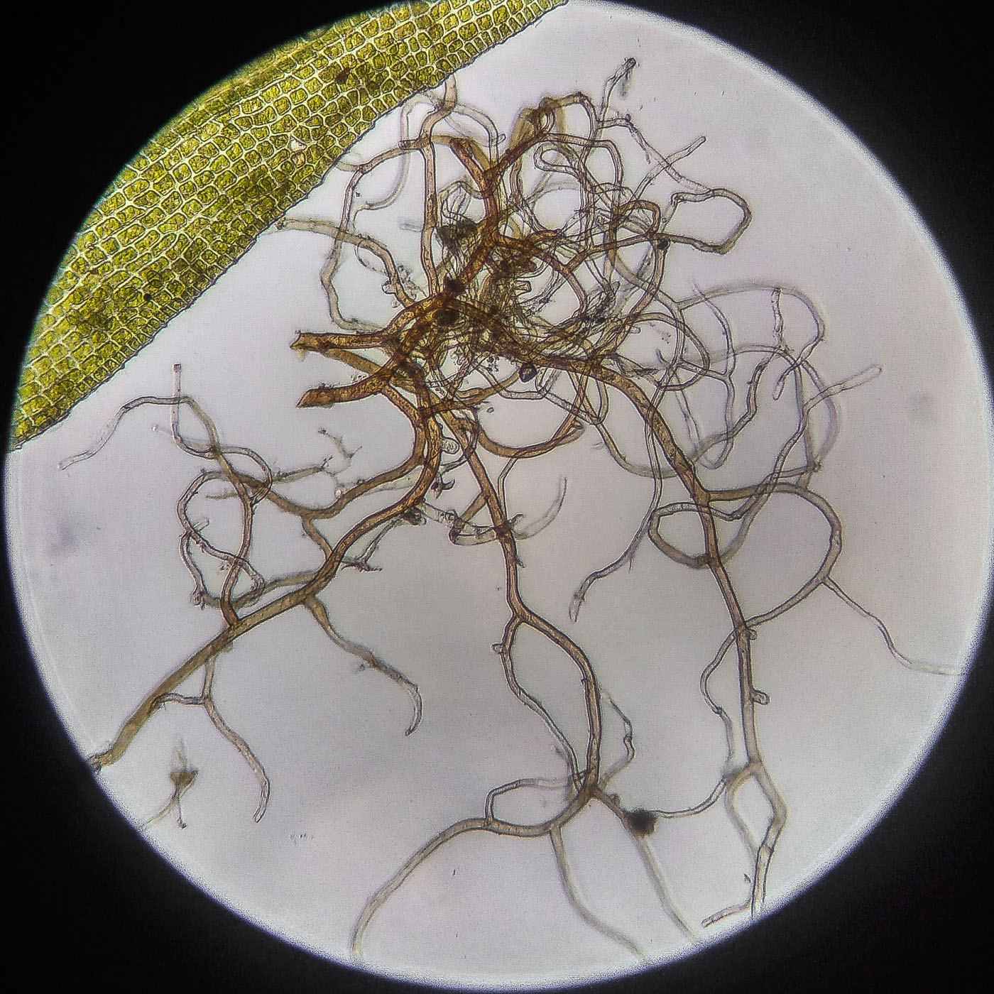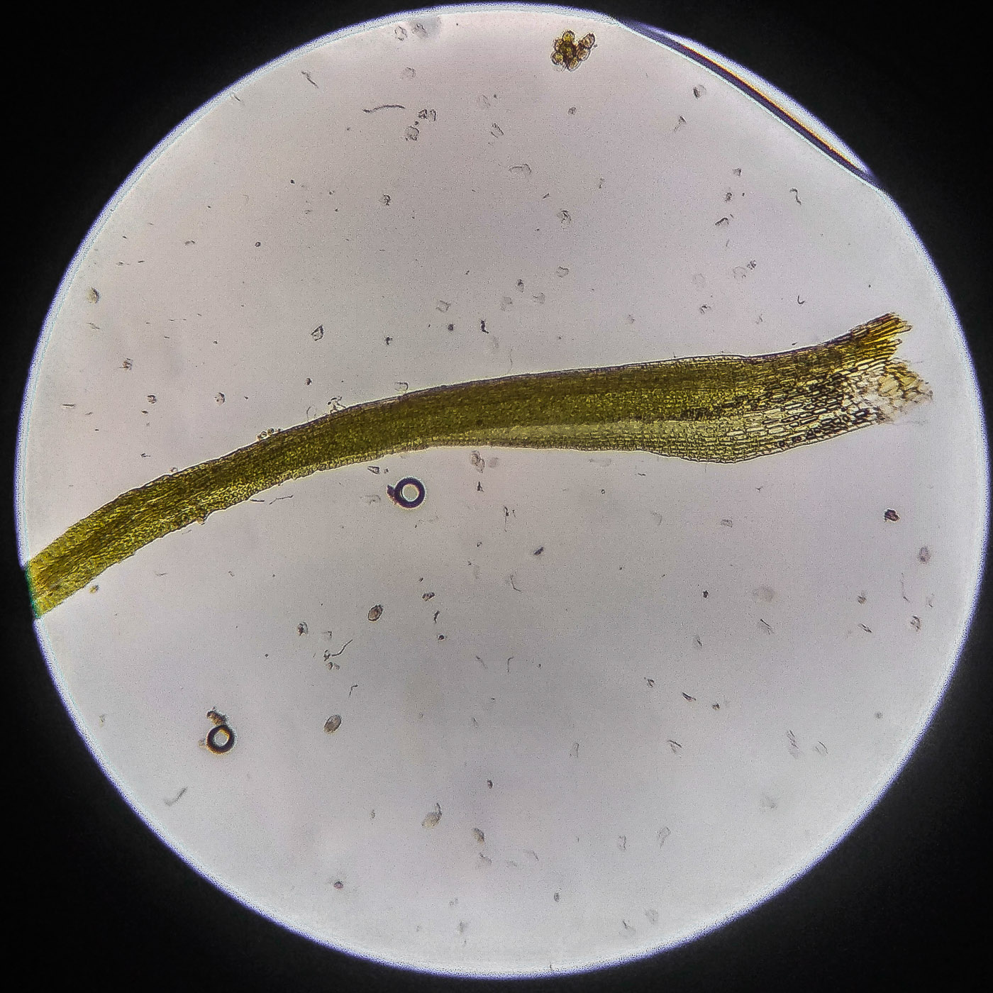 * клетки квадратные по всему краю и в верхней половине листа, мамиллозные, ближе к жилке и основанию — более прямоугольные, в основание становятся ещё шире, прозрачные или бурые; умеренно толстостенные, резко не отграничены;