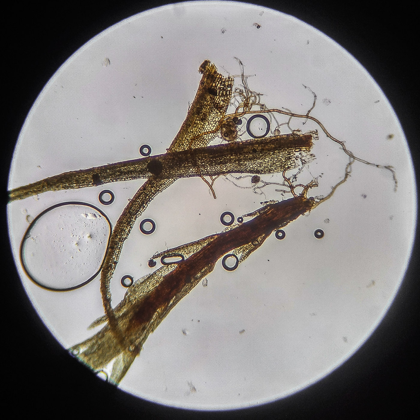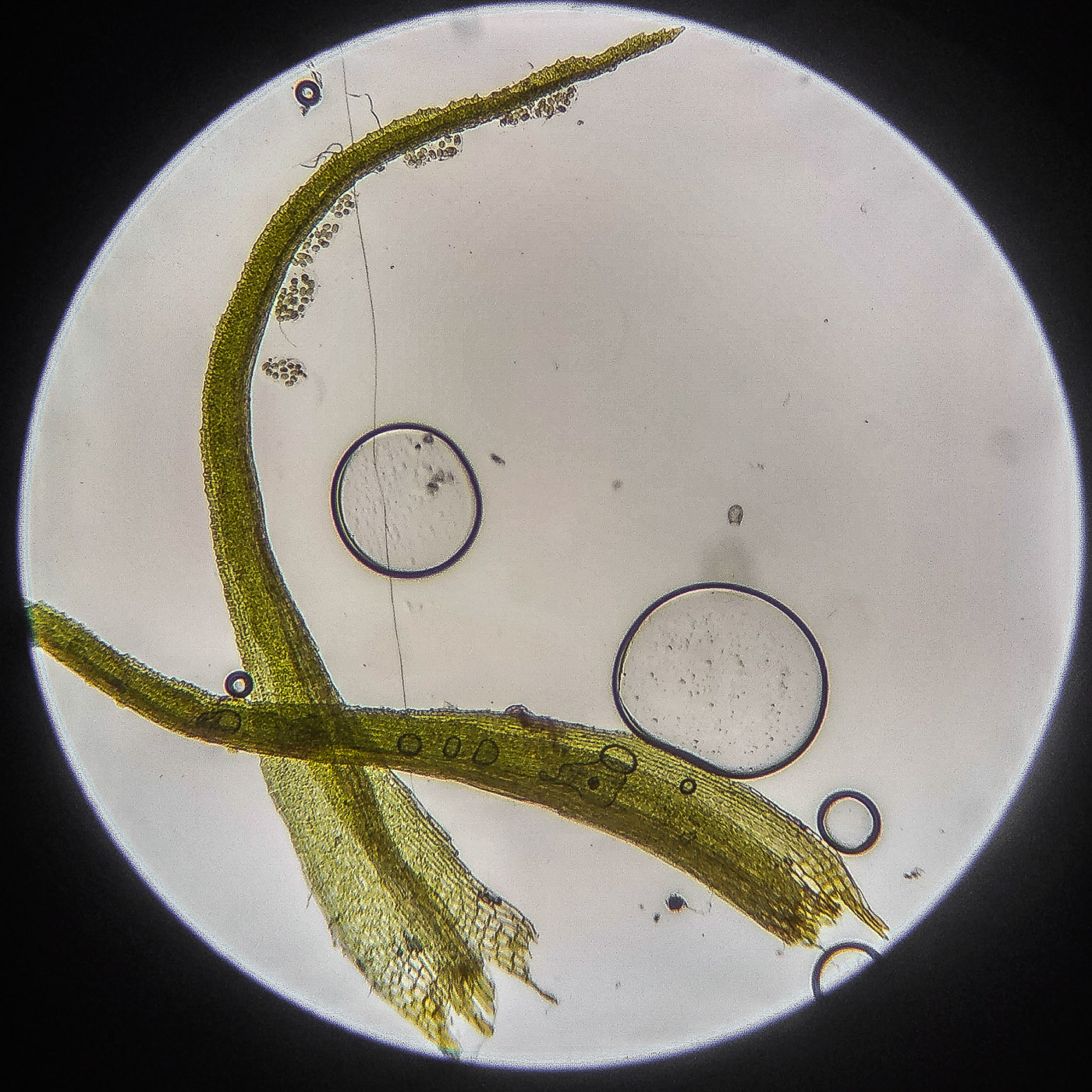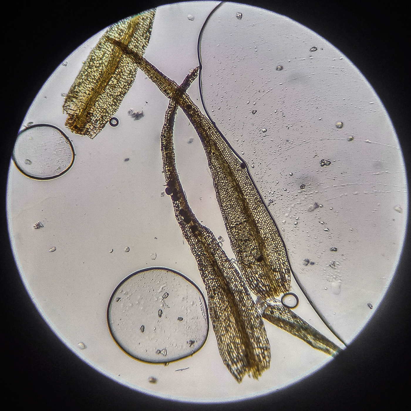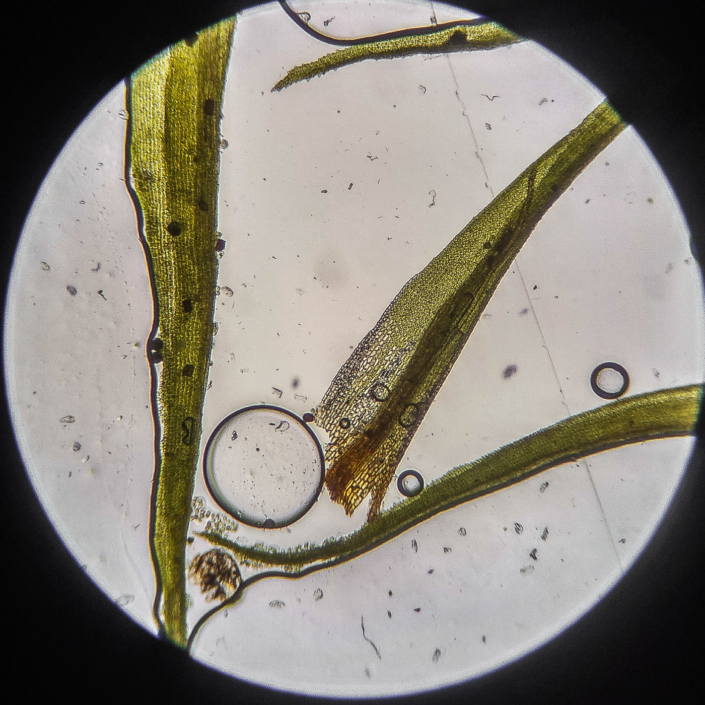 * клетки квадратные по всему краю и в верхней половине листа, мамиллозные, ближе к жилке и основанию — более прямоугольные, в основание становятся ещё шире, прозрачные или бурые; умеренно толстостенные, резко не отграничены;