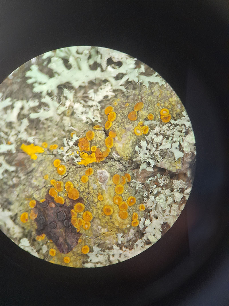 Таллом с апотециями в сообществе Xanthoria parietina, Physcia sp., Parmelia sulcata. Санкт-Петербург, Курортный р-н, ПП «Комаровский берег», на коре Malus sp. 01.11.2025.