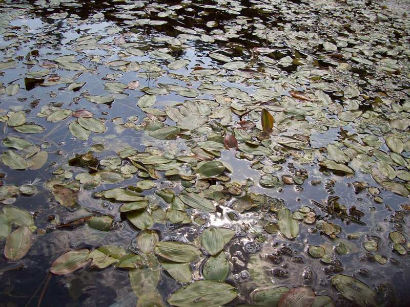 Заросли рдеста в воде у берега реки. Курская обл., Железногорский р-н, д. Ратманово, р. Свапа. 14 августа 2007 г.