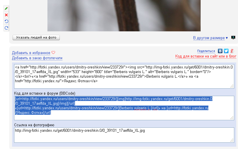 | Дмитрий Орешкин | А чтобы получить код для вставки, как это сделал Андрей, нажмите на ссылку "Код для вставки на сайт или в блог" (выделена красным, под фото), а затем из скопируйте "код для вставки в форум (BBCode)" (выделен синим):