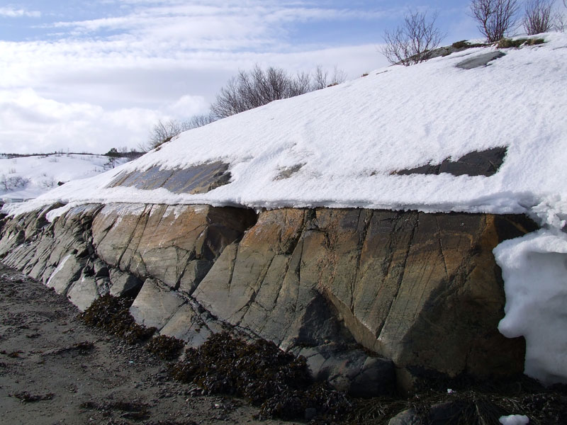 Высота прилива у устья губы метра 2-3, мне кажется. Там, где берега обрывистые, можно в малую воду по полосам мазута на камнях определить. Только пока по низу не пройти - снег тает.