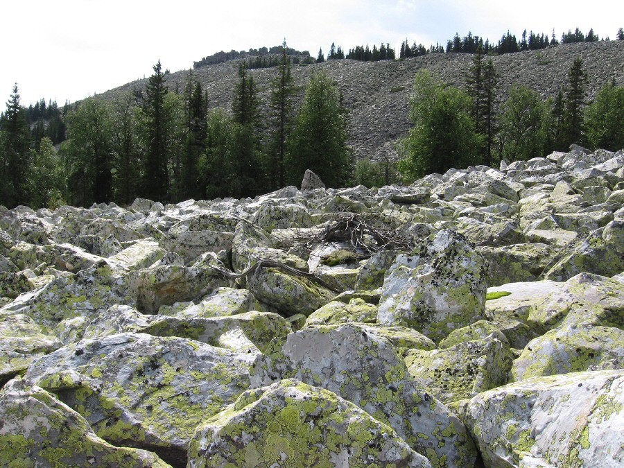 | Анна Цветкова | На Сарлыке, Горный Алтай, 2507 м, на курумниках, крупноглыбывых осыпях, который там часты по склонам, тоже почти нет растений, потому как между крупными гладкими камнями глубокие плохо освещённые ямы, и ещё медленные оползни когда снег тает. Зато на самой пологой вершине, у снежников, растительности граздо больше.
