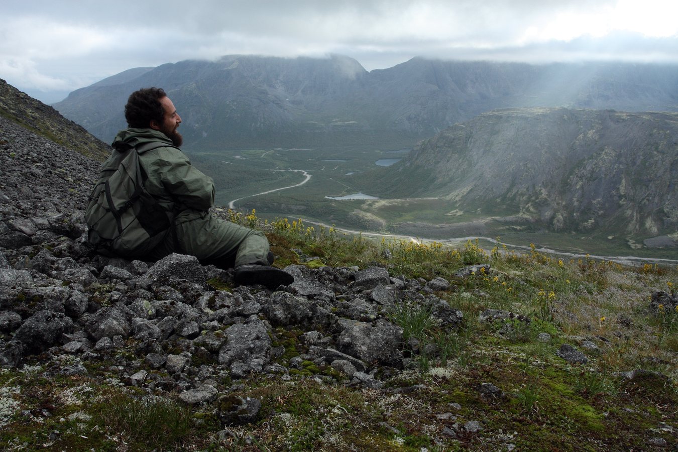 Альпийская луговинка с аспектом цветущего Solidago lapponica у выхода из ущелья на западном склоне Кукисвумчорра. Внизу — долина Вудъяврйок и находящийся в ней карьер. 11.08.2010. [лето]