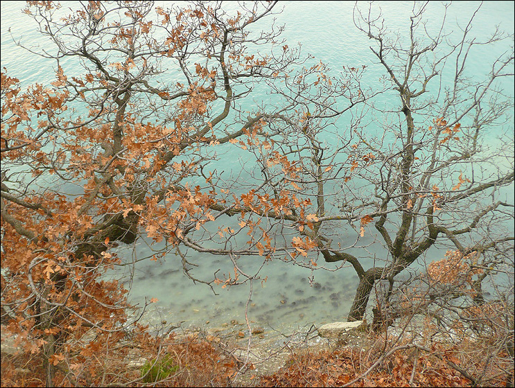 Деревья дуба пушистого (Quercus pubescens) с сухой листвой на приморском обрыве. Краснодарский край, Черноморское побережье Кавказа, город Новороссийск 22.12.2009. [зима]