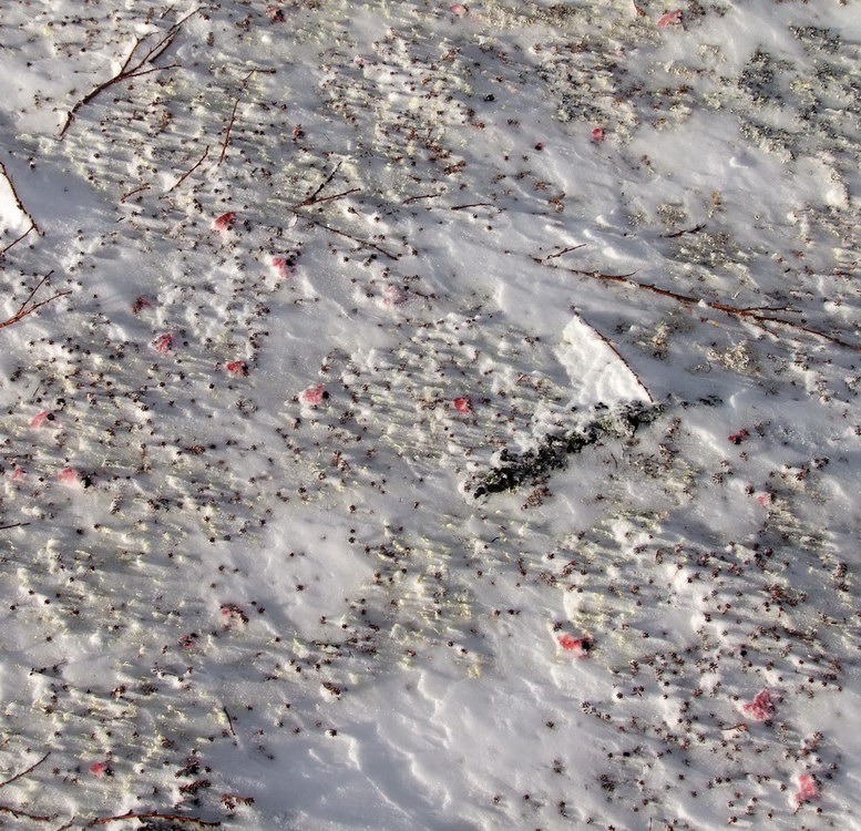 | Евгений Берестовский | Позёмка повредила ягоды арктоуса, и из них вытек сок малинового цвета.