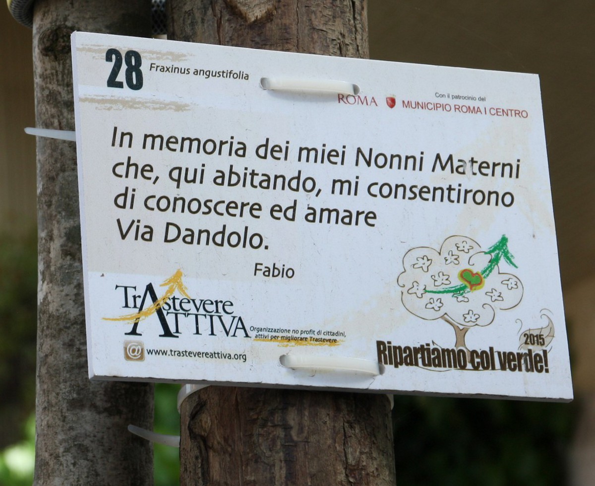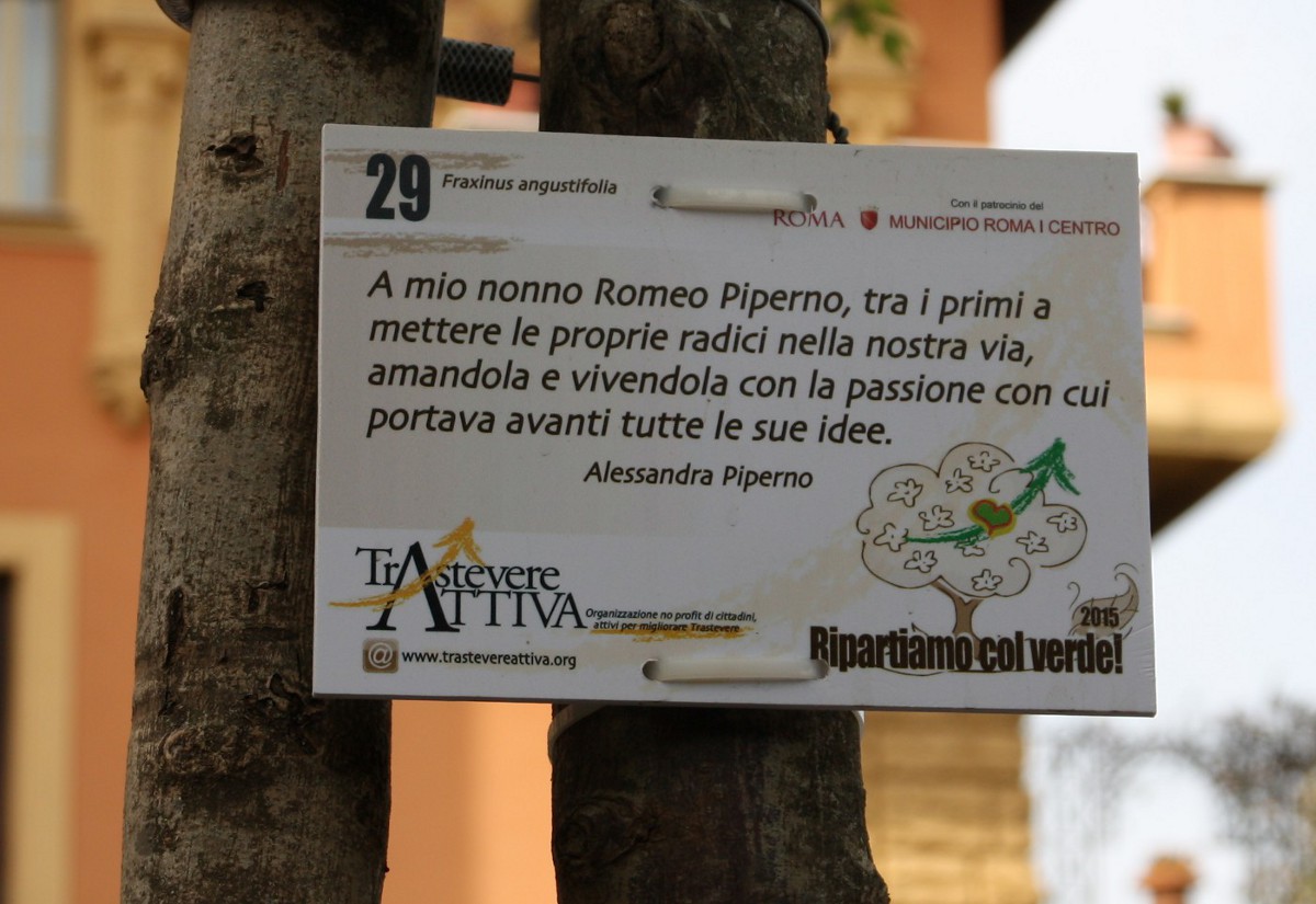 | Денис Мирин | В более новых частях Трастевере активисты с муниципальными службами высаживают в качестве спонсоров (наверное) на улицах новые деревья ( Fraxinus angustifolia). На одной улочке все деревца были с такими табличками (содержание на каждой табличке своё):