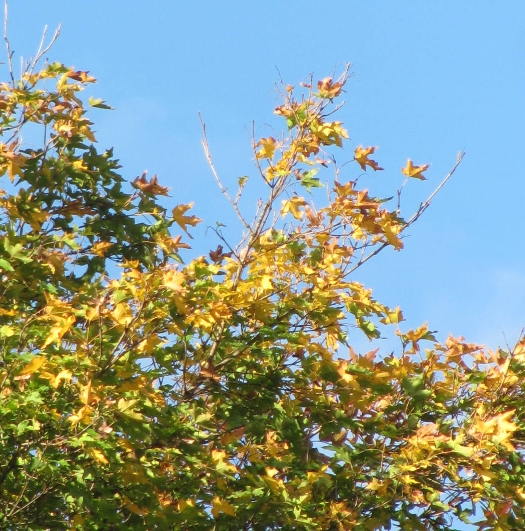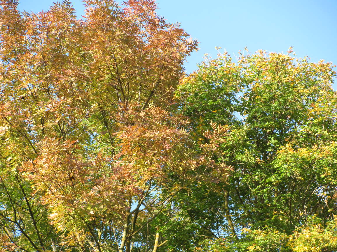 | Анна Малыхина | Просто там, в центре кадра, вероятно, сразу несколько деревьев растет: с краснеющими листьями- ясень, с зелеными, чуть позолочеными может быть вяз, а по бокам от них - топольки белые (или гибридные) с белыми стволами. |