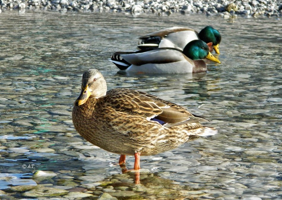 Русло р. Изар при малой воде. Вдали краснеет живая изгородь из буков. На горном склоне буковый лес (Fagus sylvatica?) с примесью ели (Picea). На переднем плане небольшая заводь с утками кряквами. [зима]