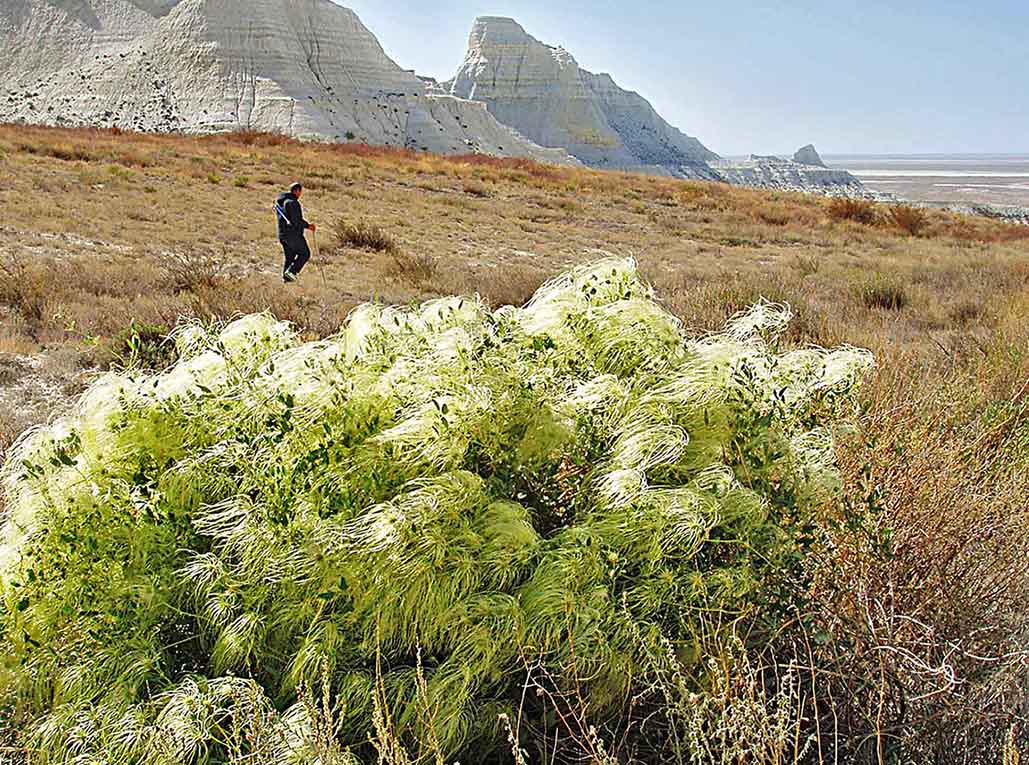 | Людмила Султанова | Самым интересным растением было растущее рядом, на ровной степной поверхности - среди серебристой травы в нескольких местах прямо на земле гроздьями "сидели" красивые, нежного, слегка розоватого цвета с прожилками, тонкостенные шарики, до 5 см в диаметре. Тронешь их - рассыпаются. У физалиса отдаленно похожи "шарики", но они крепче. Я искала в сети, в определителях - нигде не нашла ничего похожего. Наконец в книжке В.Мосолова "Кто живет в пустыне" нашла похожее описания косыка - степной моркови "гроздь крупных розоватых, с фиолетовыми прожилками, пузырей, лежащих прямо на земле." Может быть кто-нибудь видел такое? Резче сделать фото не смогла. Сильно промахнулась с фокусом. Ну а выяснилось только дома - ведь все на пленку снималось.