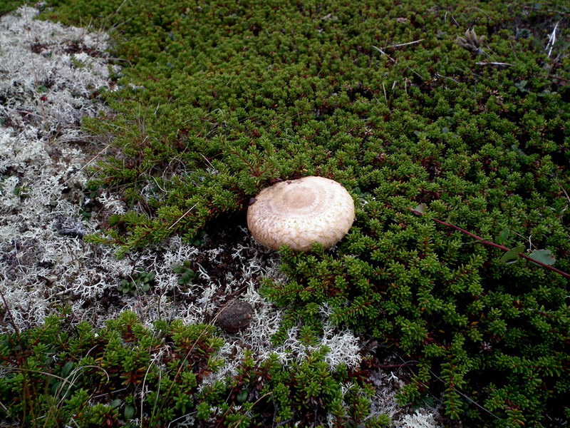 Розовая волнушка среди лишайников в седловине на вершине сопки. [конец лета — начало осени]