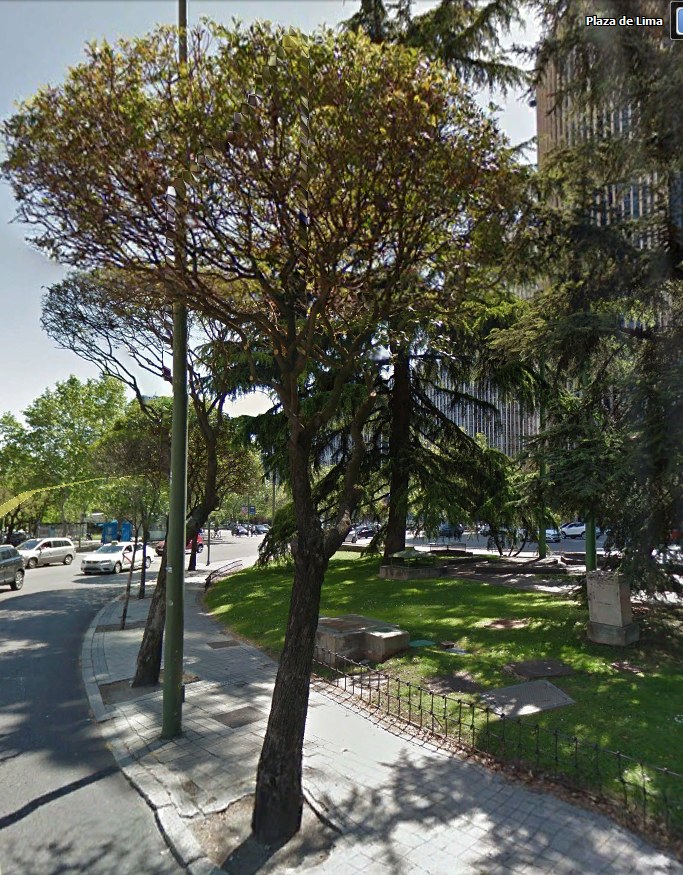 Кедры в озеленении площади Лимы в Мадриде. Вид со стадиона Santiago Bernabéu. [зима]