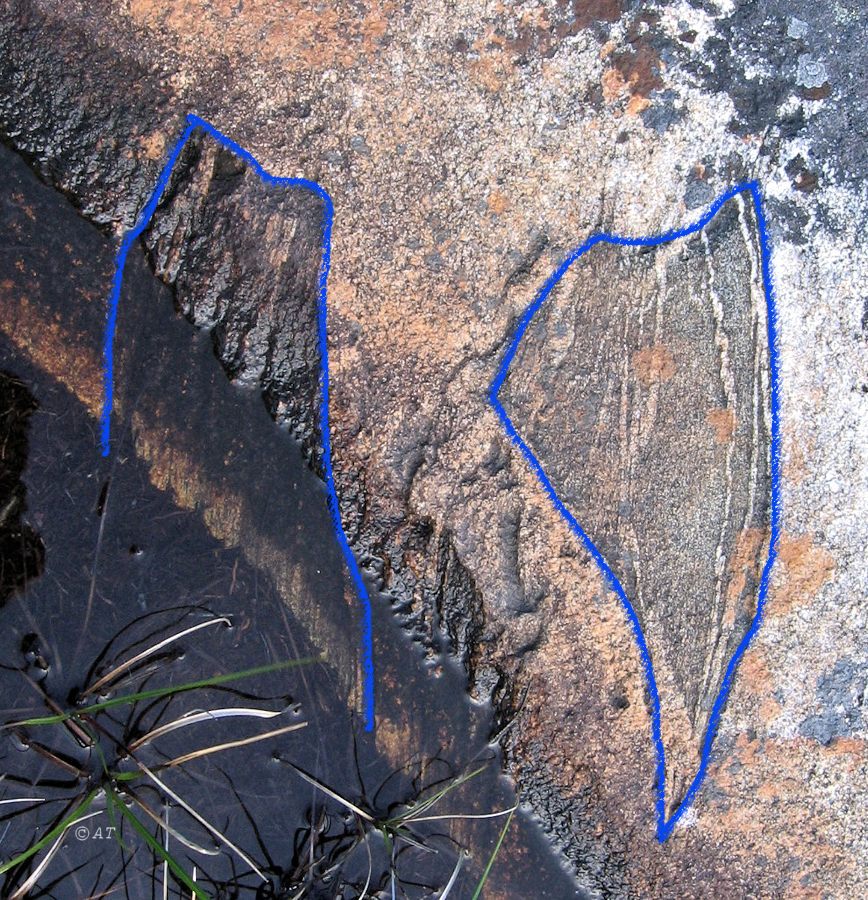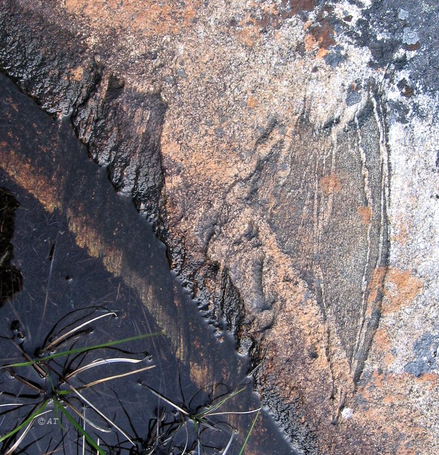 Береговые граниты, обработанные ледником. В зоне забрызга видна растительность. [лето]