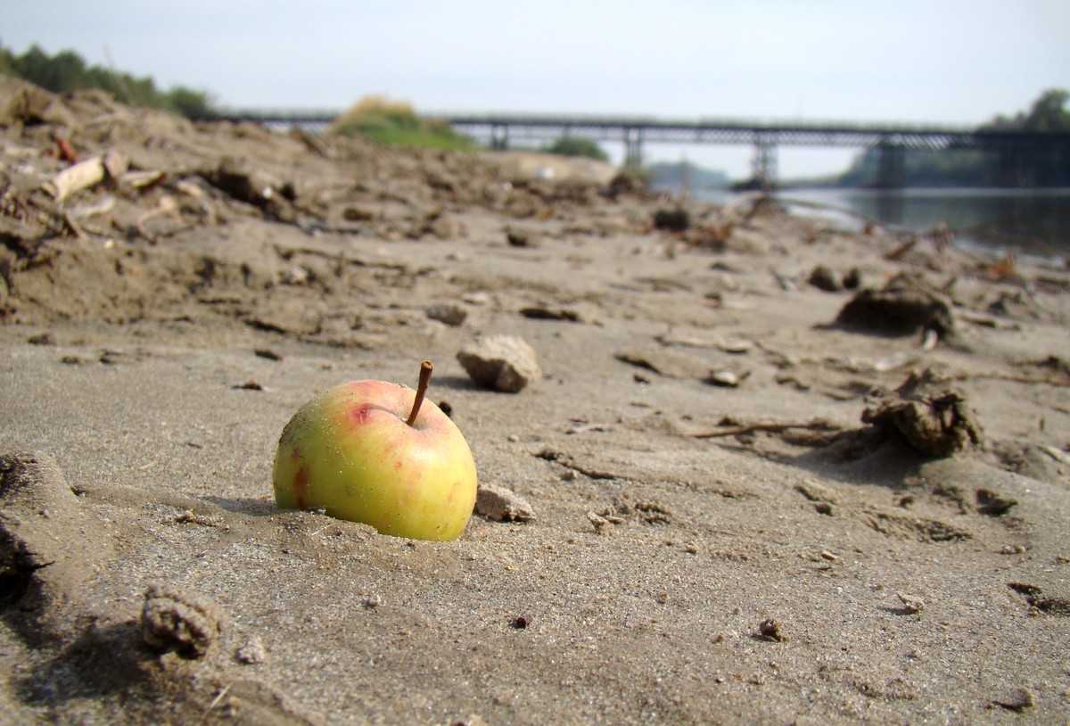 Берег реки Кубань, низкая вода. Вид на старый Хатукайский мост. Над высоким берегом белеет памятник на братской могиле 370 мирных жителей и пионера-героя Муси Пинкензона, расстрелянных фашистскими оккупантами в 1942 году. [осень]