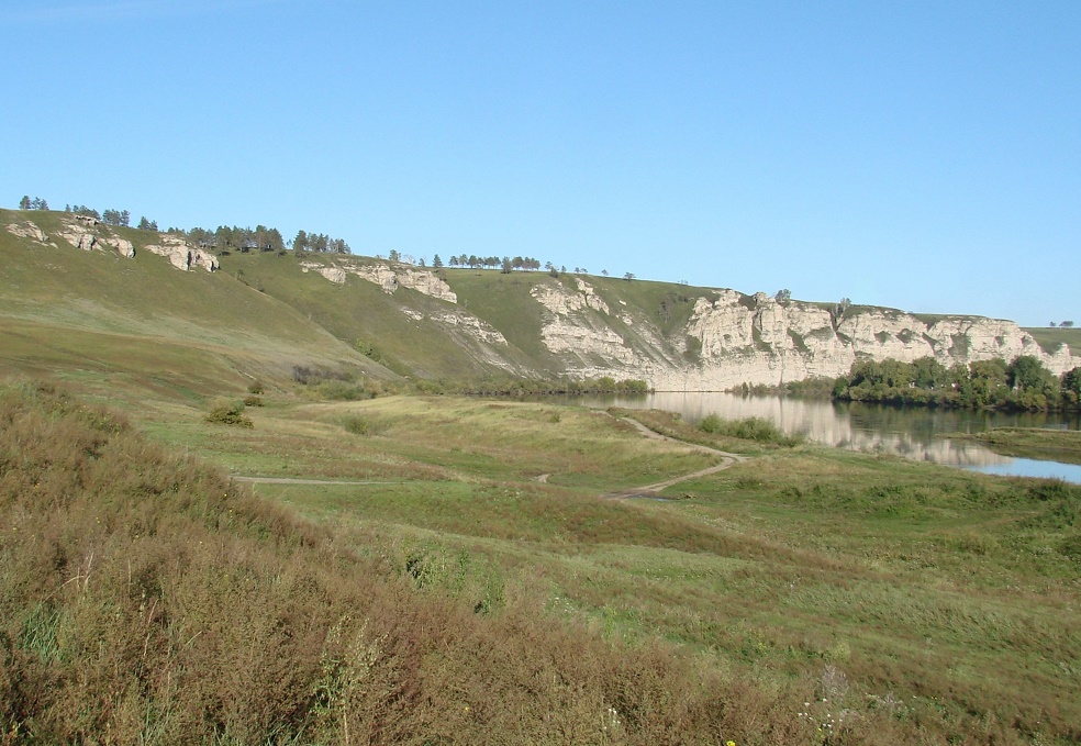 Левый высокий берег р. Белая с перелесками из берёз (Betula) и сосен (Pinus), лугами остепнёнными и разнотравными. 20.05.2017. [конец весны — начало лета]