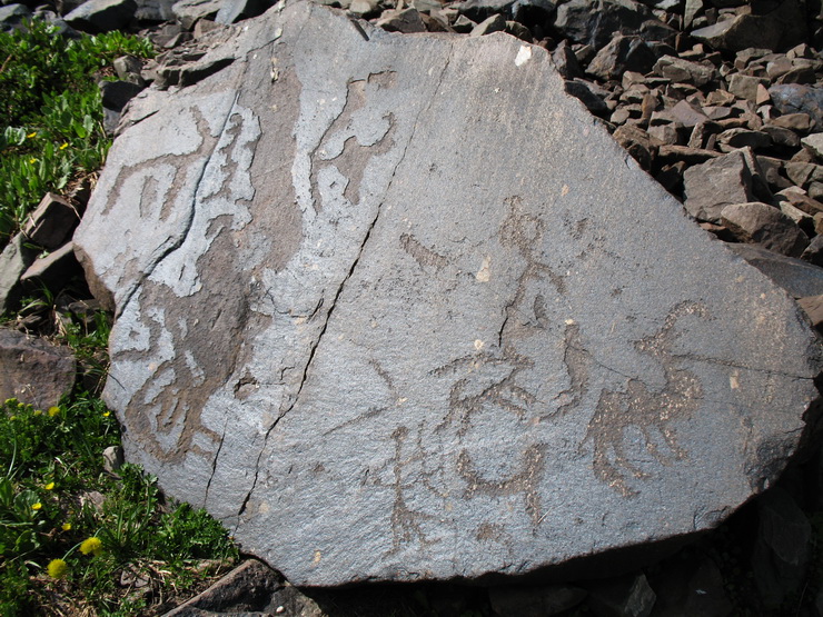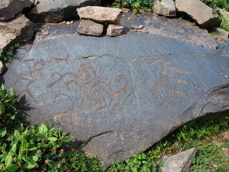 Альпийская растительность с участием Aconogonon hissaricum, Rhodiola heterodonta, Ranunculus rubrocalyx и Anemonastrum protractum на моренных отложениях урочища Каскабулак, 3150 м н.у.м. 16 июля 2017 г. (Со времен раннего железа это урочище интенсивно использовалось для сезонного, 2-3 месячного выпаса животных и охоты, о чем свидетельствуют многочисленные здесь петроглифы. В эпоху бронзы это место было еще непригодно по причине оледенения, так как рисунки того времени встречаются только на 1000 м ниже.). [лето]