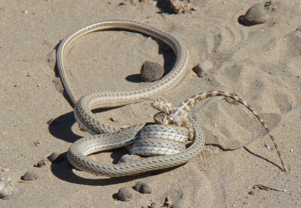 Ювенильная особь степной агамы (Trapelus sanguinolentus). В центре — веточка плодоносящей Peganum harmala. На почве выделяется сухое соплодие Cousinia affinis. На заднем плане зеленеет Atraphaxis spinosa. [осень]